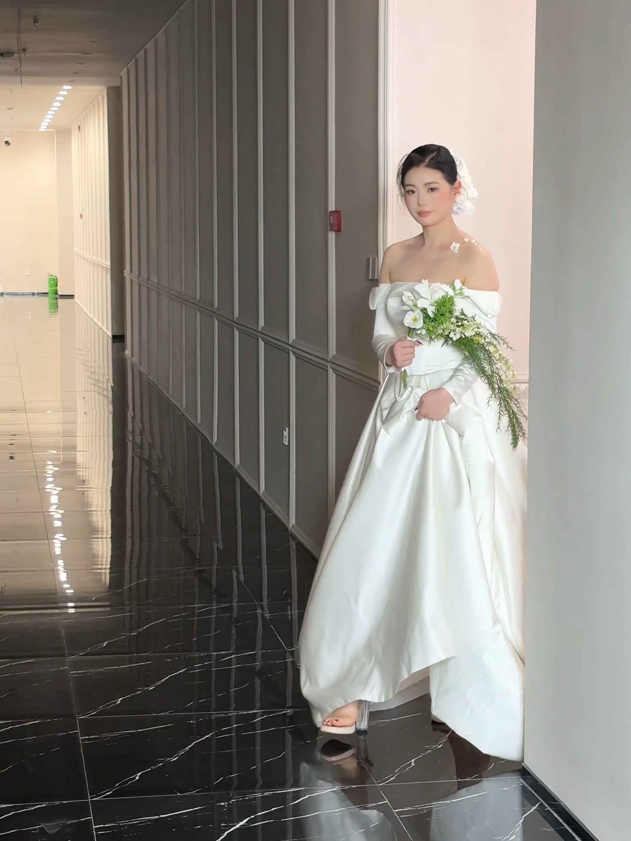缎面一字肩轻纱