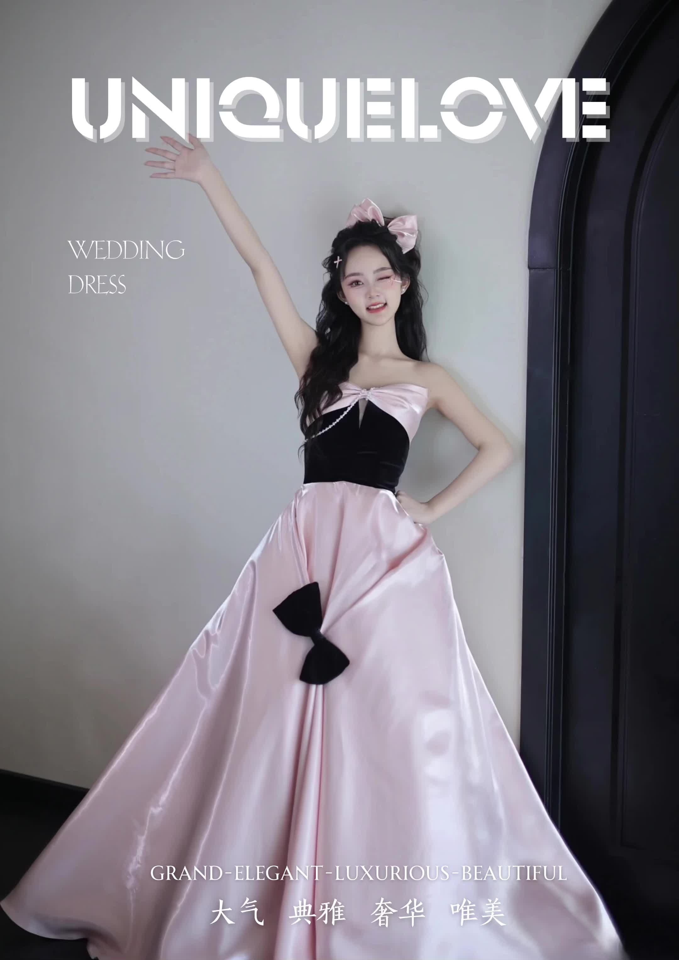 粉黑对比色抹胸蝴蝶结晚礼服