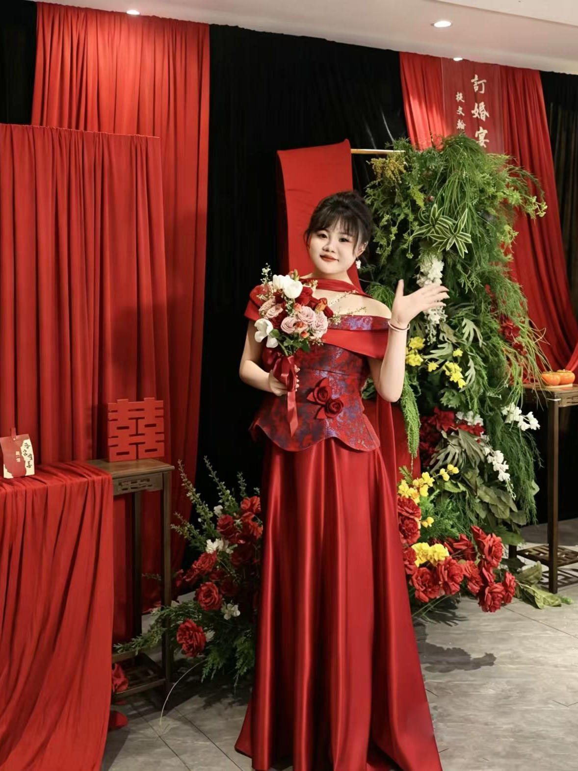 红韵藏花,缎面生香,一字肩礼服