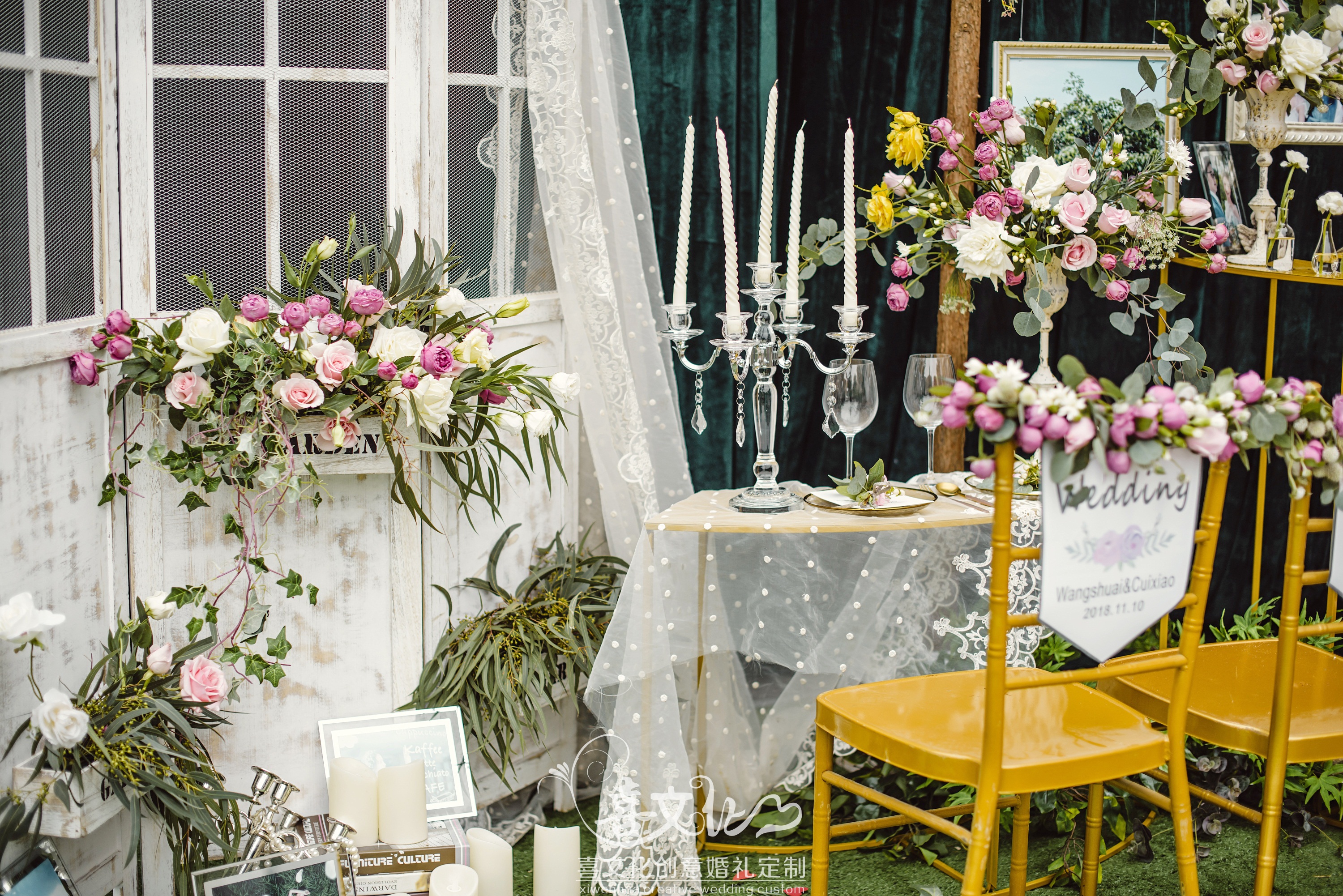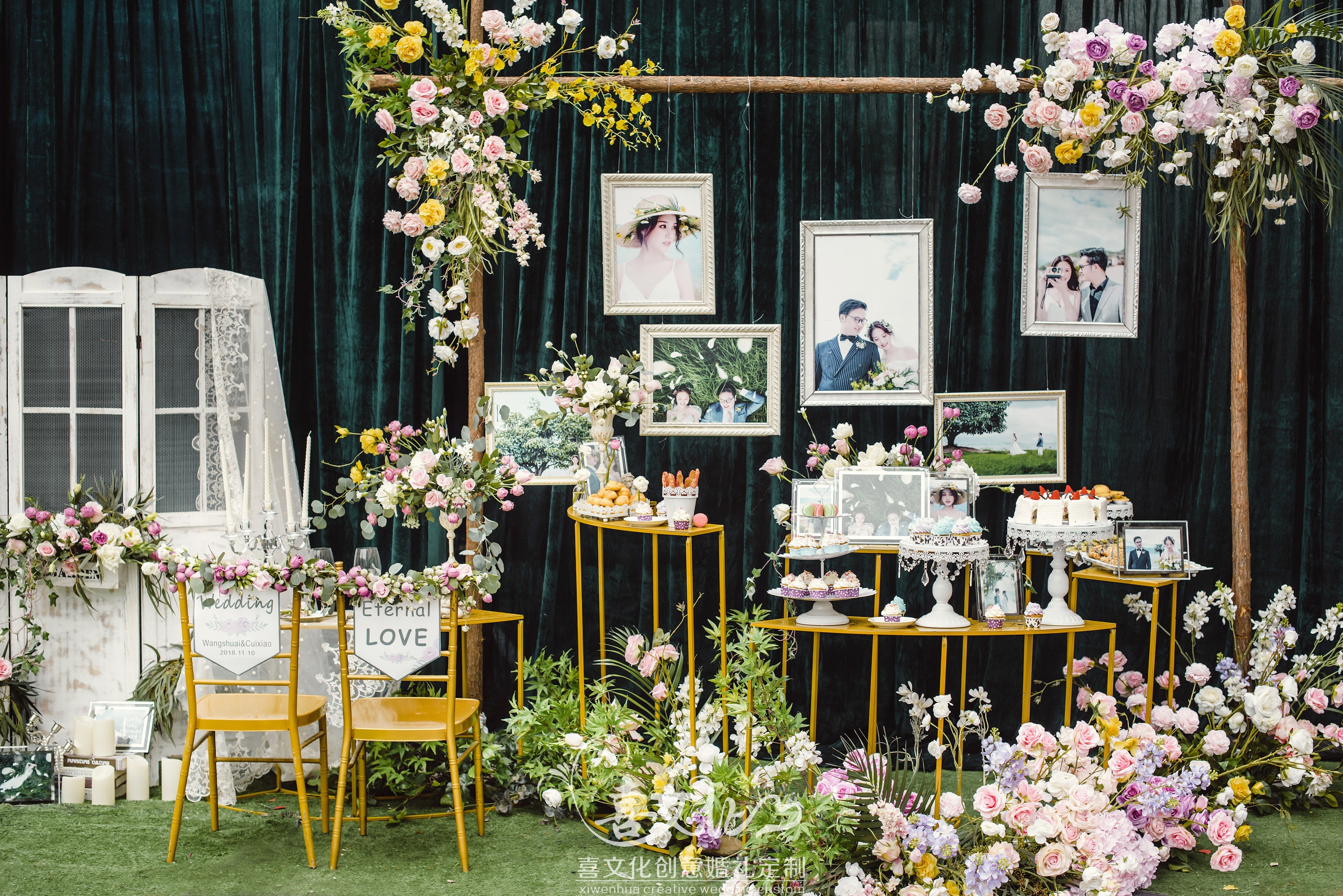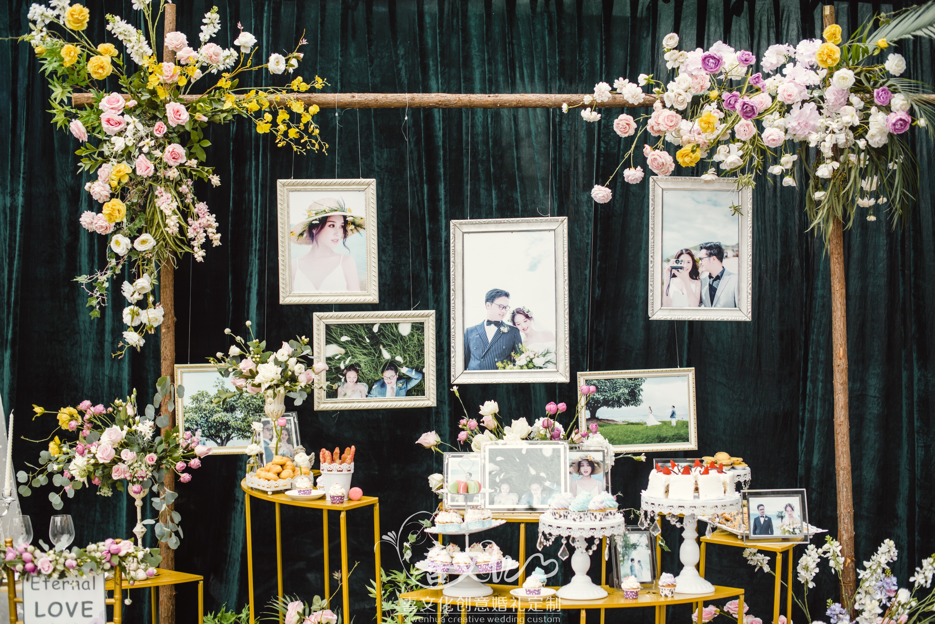 3Mx4M婚纱迎宾海报一套 迎宾指引牌一套、欧式相框、木质展架 签到台主题色背景一套、原木支架、高仿真花艺、欧式相框、照片彩扩 签到桌桌面装饰一套 木质三联门、精致摆件、高仿花艺装饰