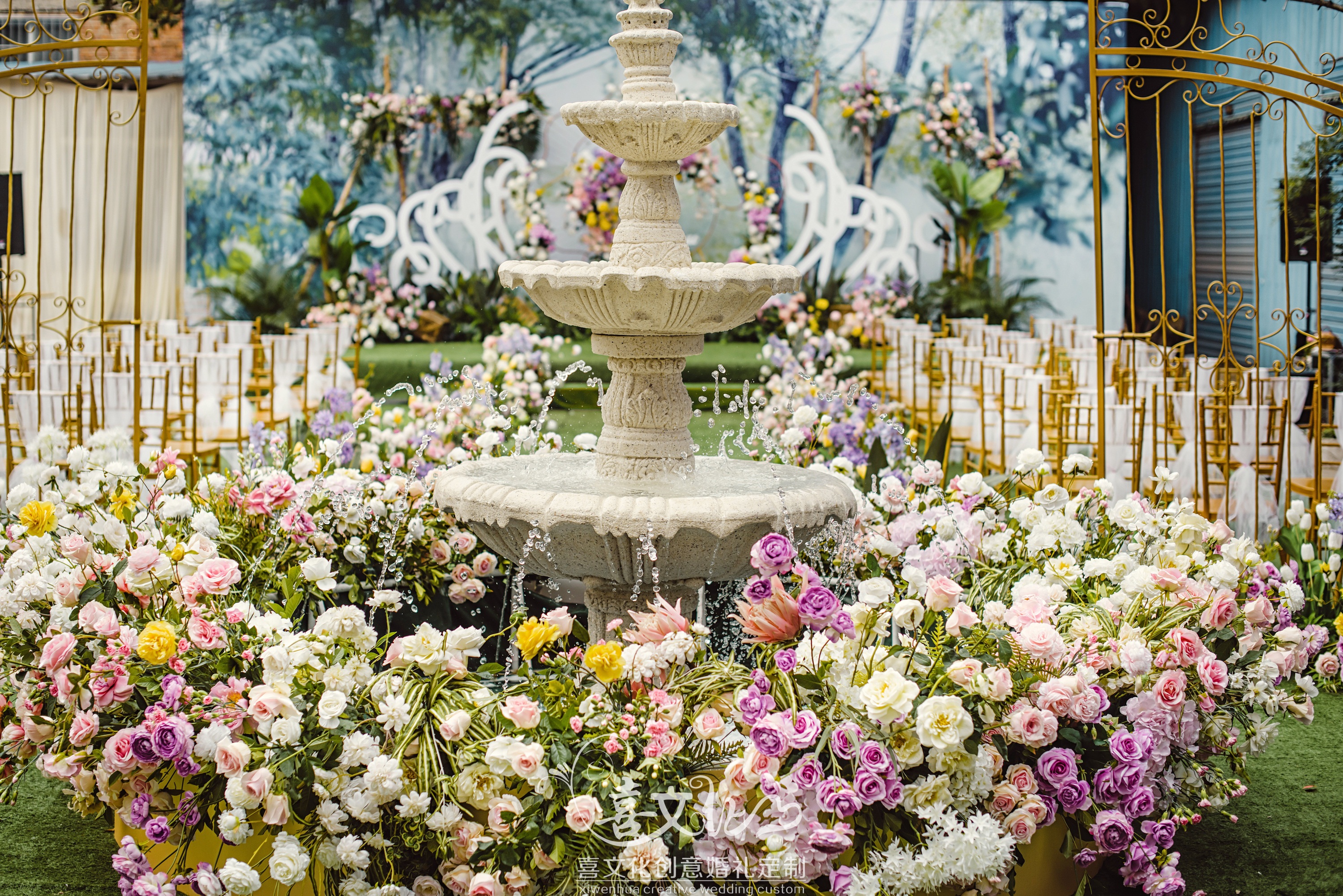 主背景精喷写真造型、桁架支架 定制主题LOGO雕刻 金色千丝万缕铁艺造型、白色镂空雕刻造型、原木支架、高仿花艺 主舞台搭建、主舞台绿色仿真草皮地毯 主会场地面仿真草皮地毯覆盖 高仿花艺路引10套、原木桩装饰 大型复古岩雕喷泉、高仿花艺装饰 金色欧式铁艺大门2套