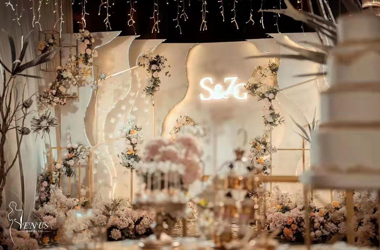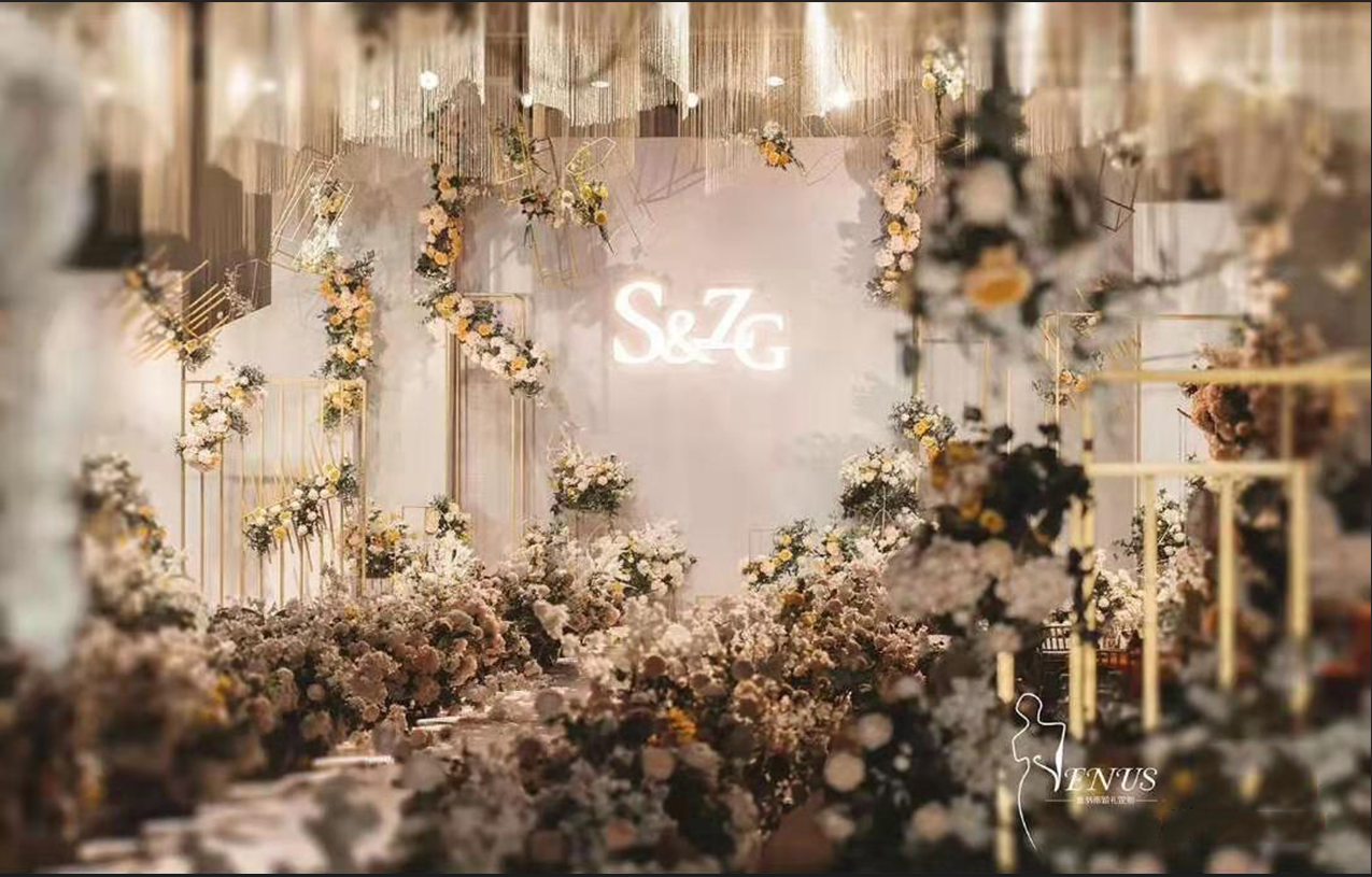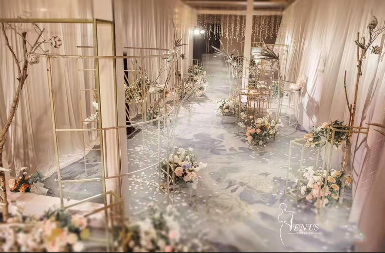 时尚立体创意背景一副(含 立体设计,含 立体材料背景装饰) 创意鲜花路引10个(组成幸福大道 ) 创意绢花花厅1个( 幸福大道入口) 创意地毯20米 顶级镜面T台 七彩泡泡机一部(含泡泡油) 舞台干冰一组 专业舞台TUSS架一组 专业花厅TUSS架设计