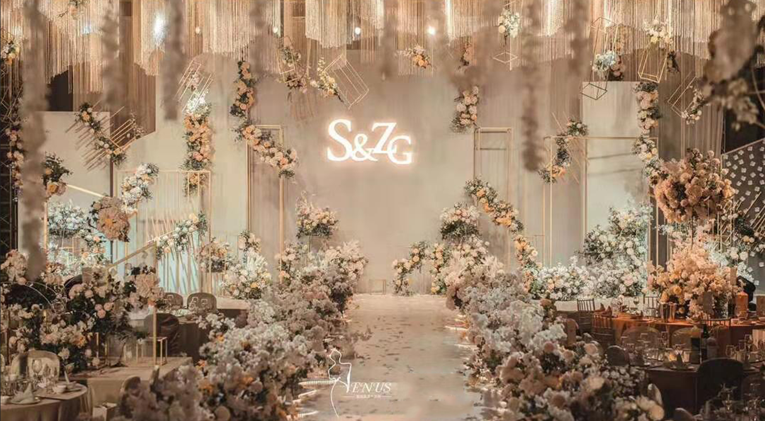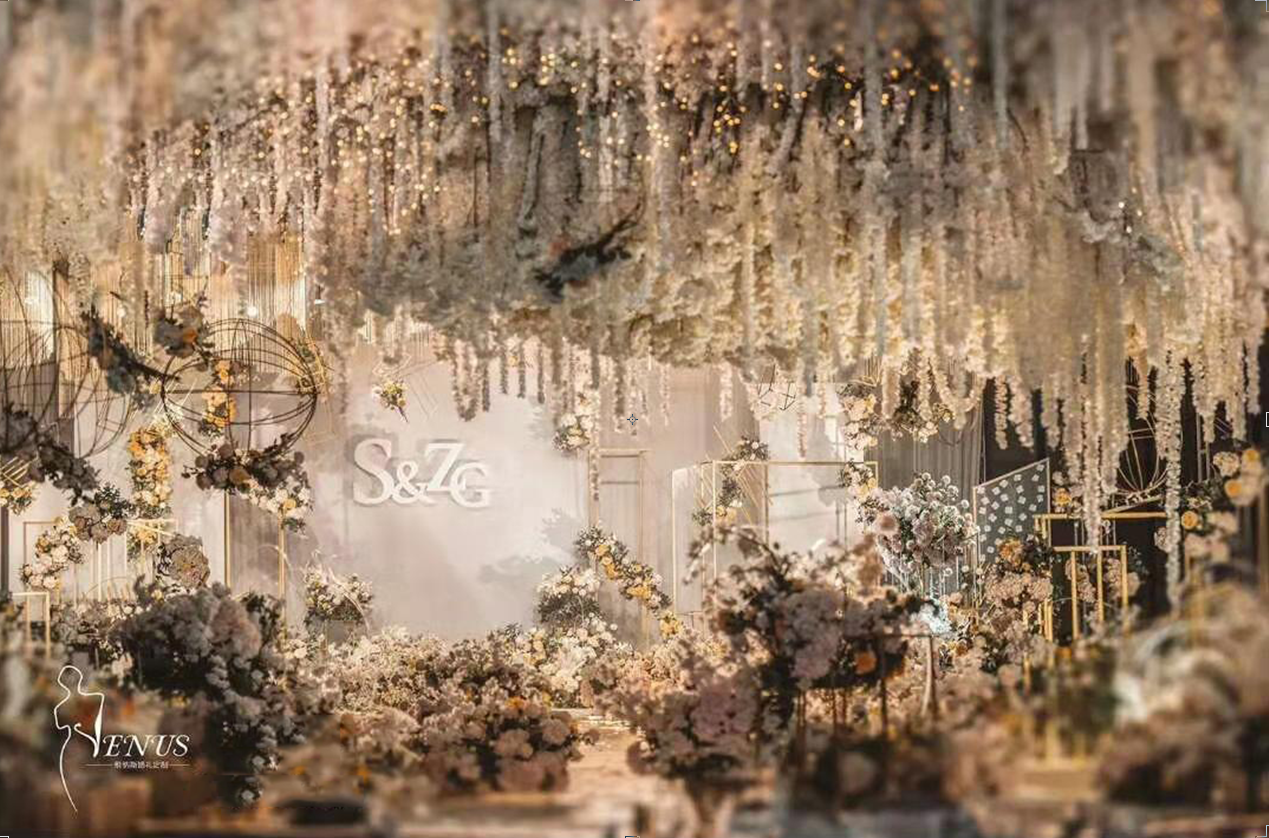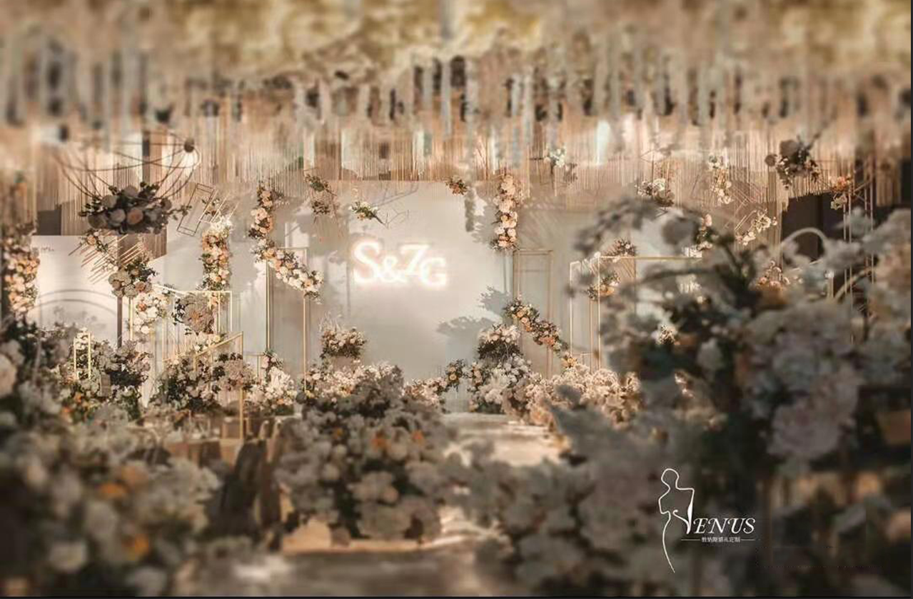 时尚立体创意背景一副(含 立体设计,含 立体材料背景装饰) 创意鲜花路引10个(组成幸福大道 ) 创意绢花花厅1个( 幸福大道入口) 创意地毯20米 顶级镜面T台 七彩泡泡机一部(含泡泡油) 舞台干冰一组 专业舞台TUSS架一组 专业花厅TUSS架设计