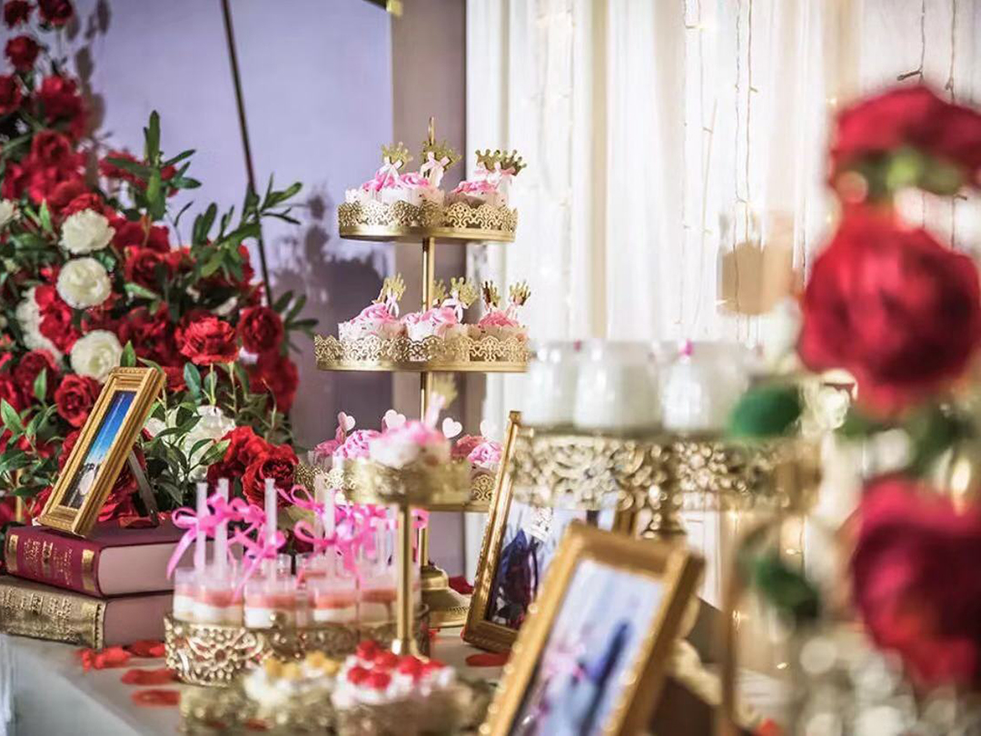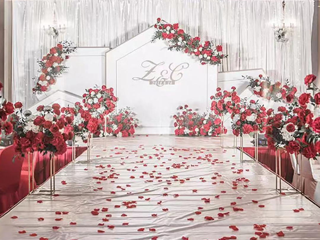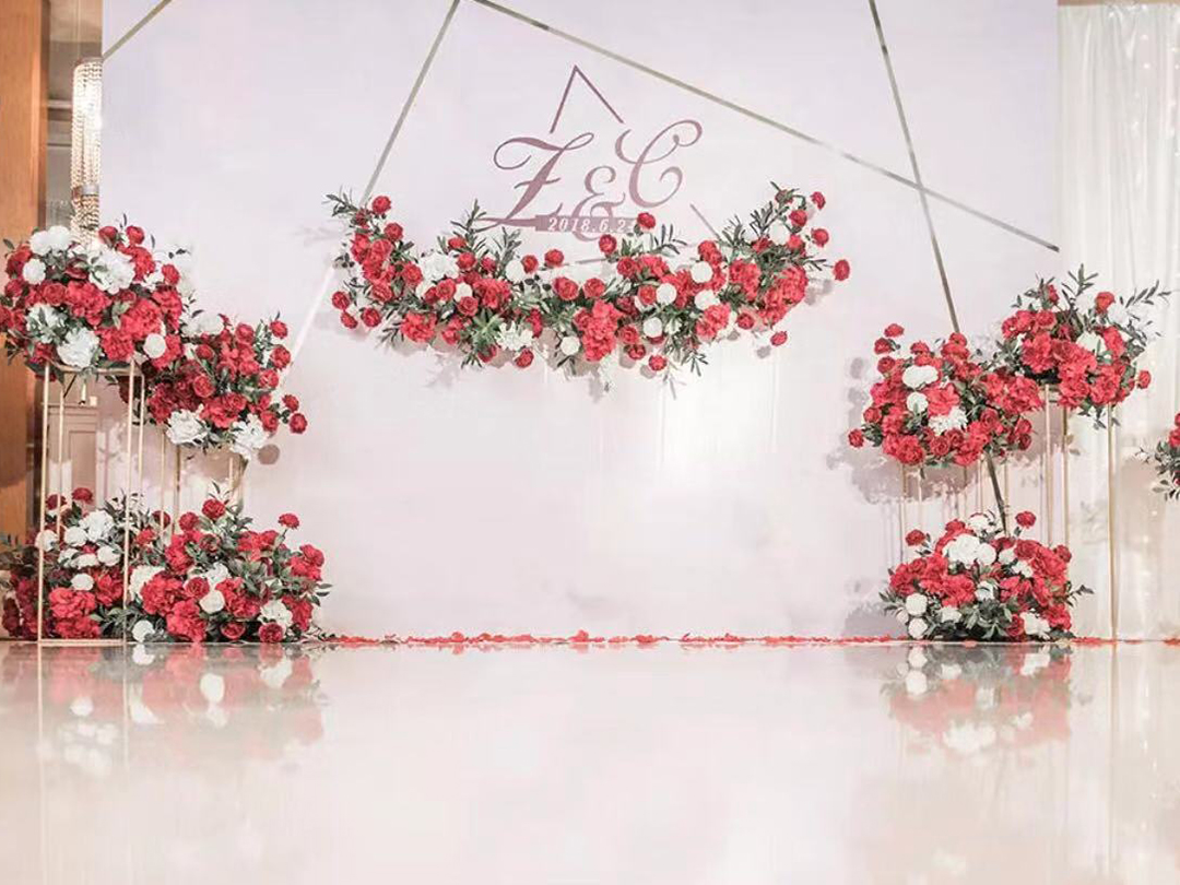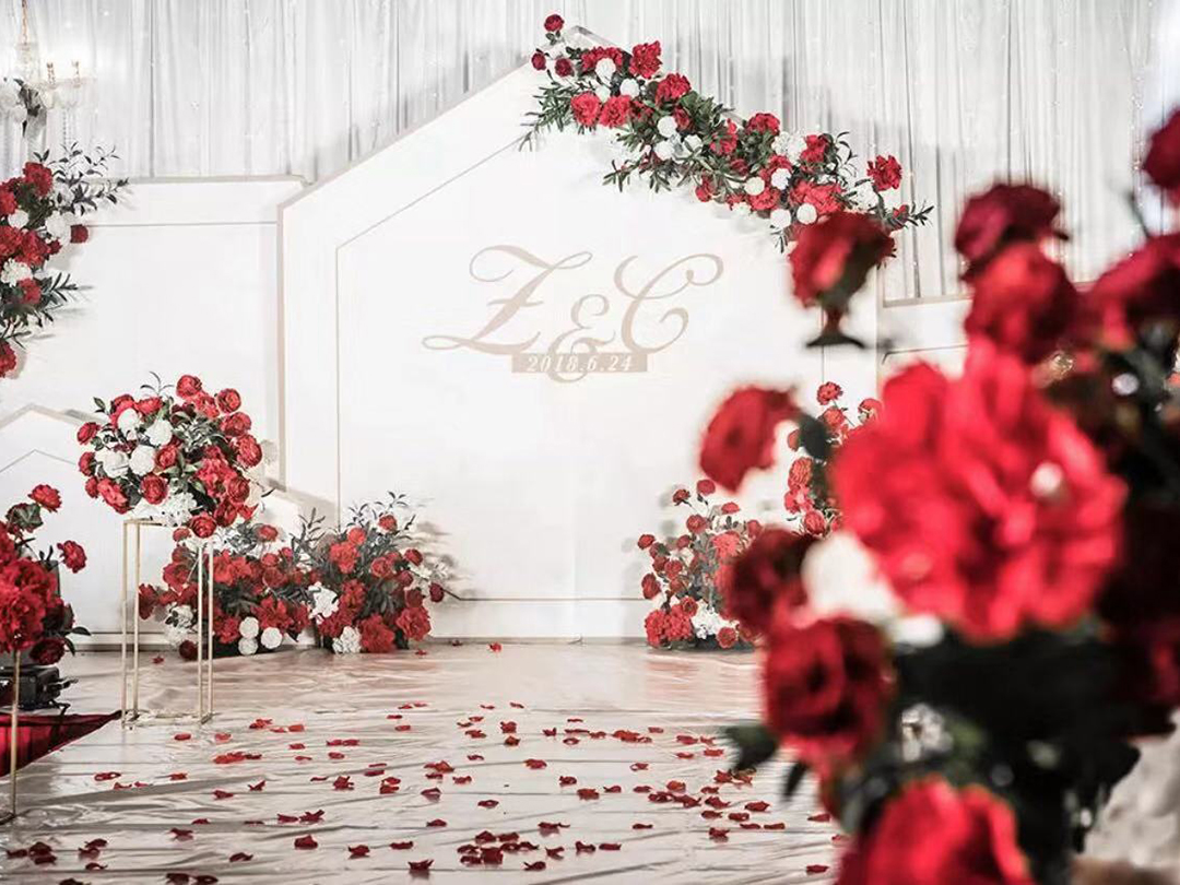 迎宾区布置(4*3M,根据场地可能有所变动),主题迎宾牌2个,合影区场景搭建,花艺,灯光布置