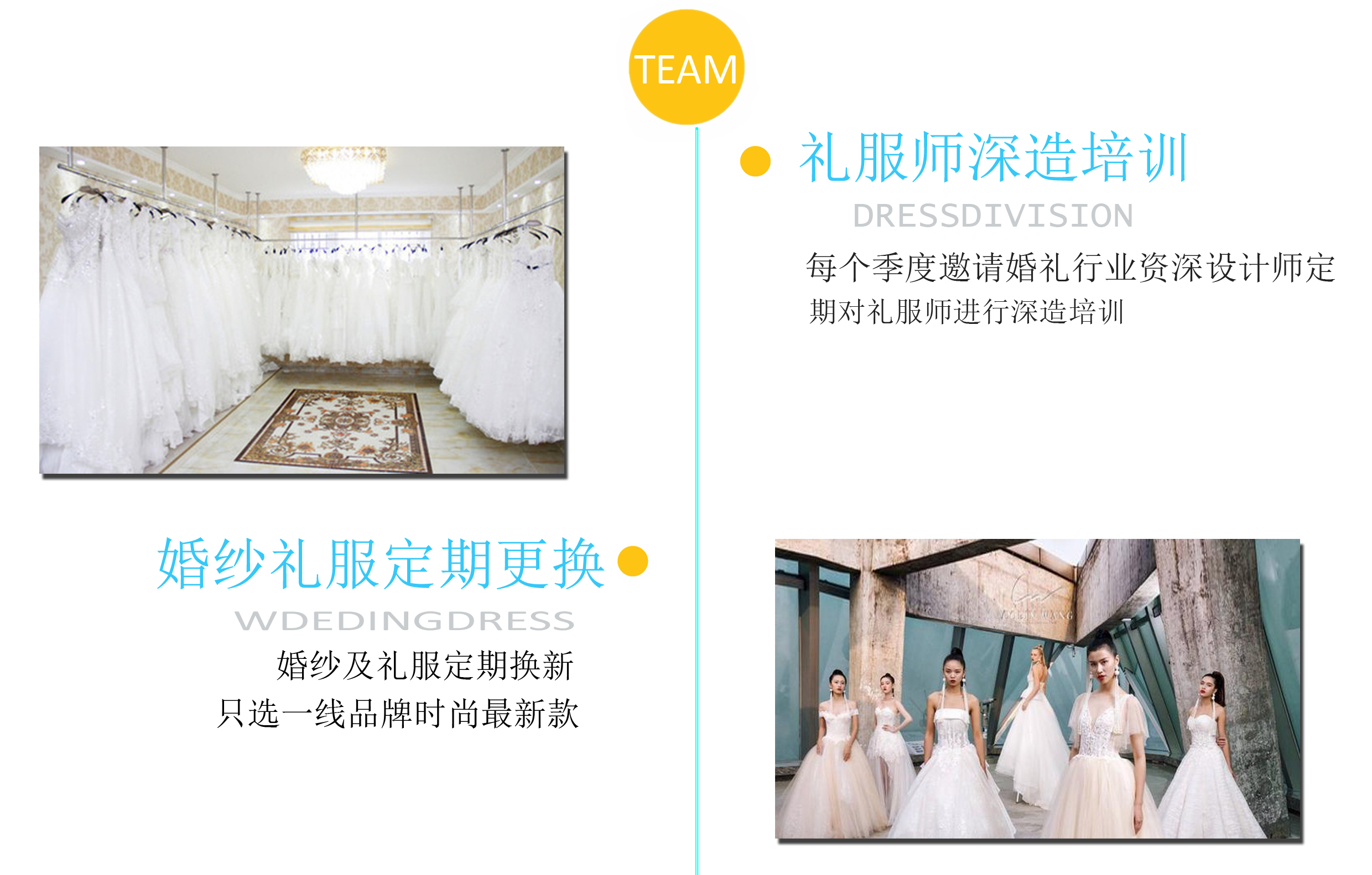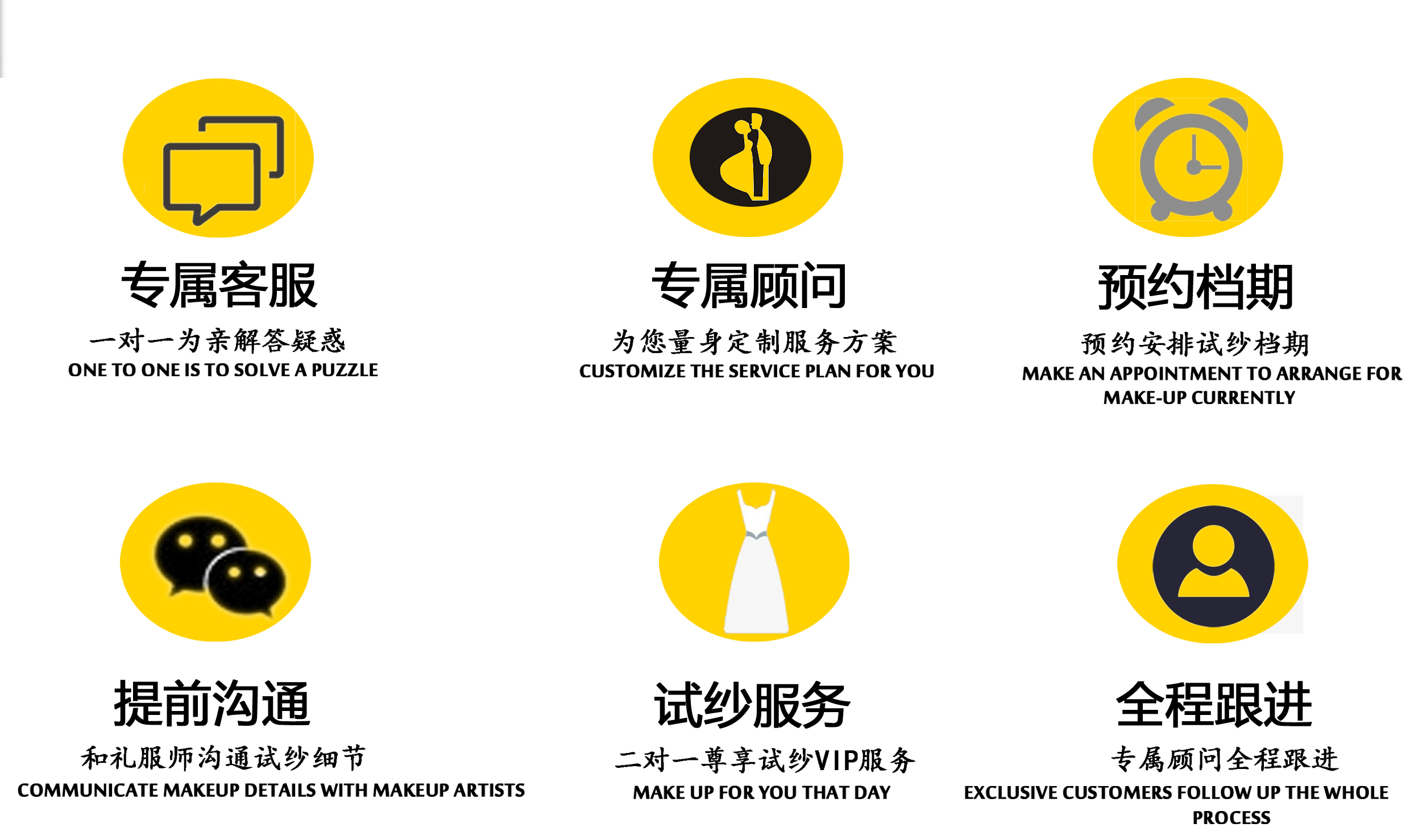 1、免费试纱:店内婚纱均可以免费试穿 2、拍照留念:试纱过程中可以拍照留恋 3、专属服务:专享店内二对一VIP会员尊享服务