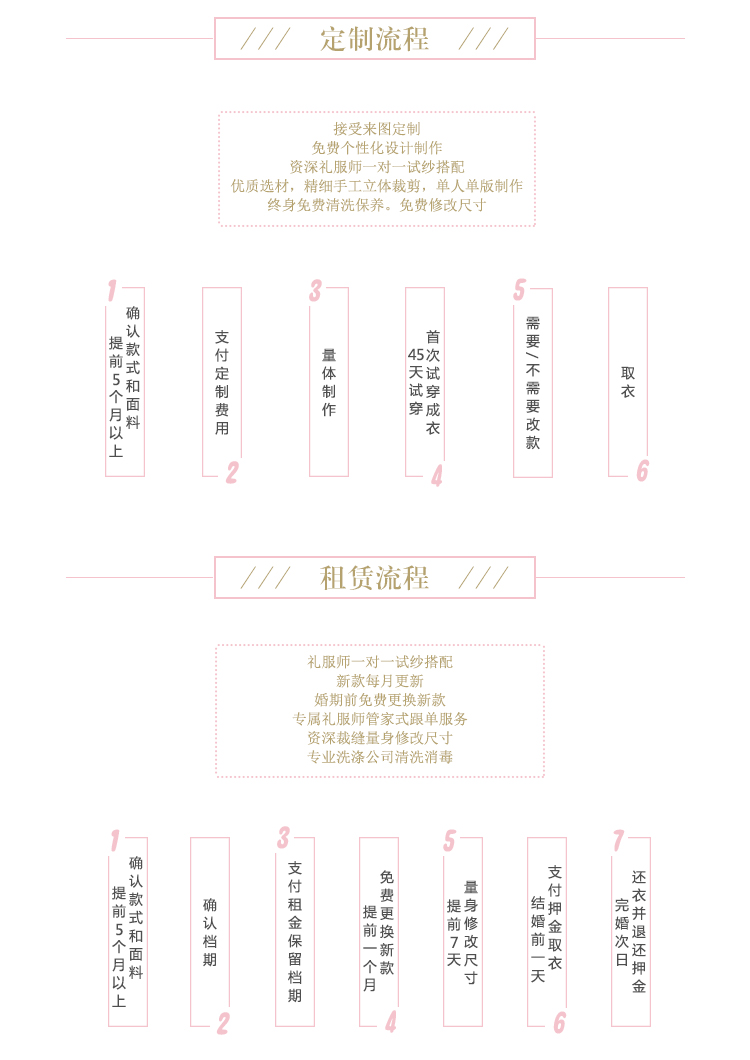 1.免费试装:店内婚纱均可免费试穿 2.拍照留念:感受个性化量身定制服务、试穿过程中拍照留念 3.专属服务:专享店内一对一VIP会员尊享服务 4.在线预约:至少提前三天预约确保试纱环境