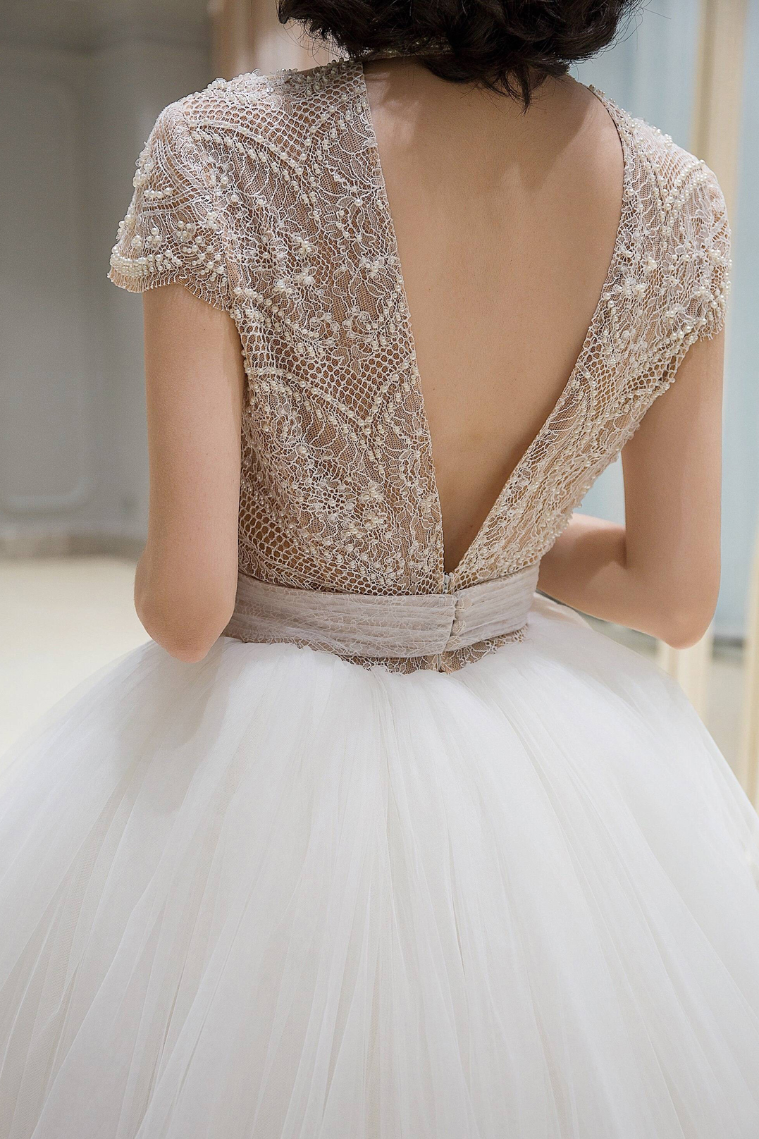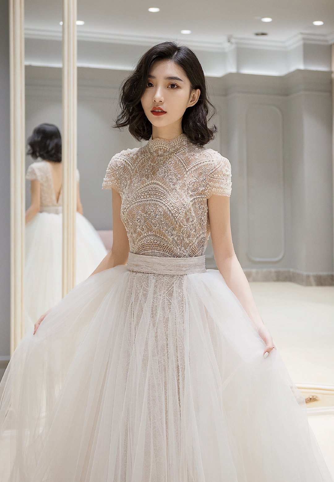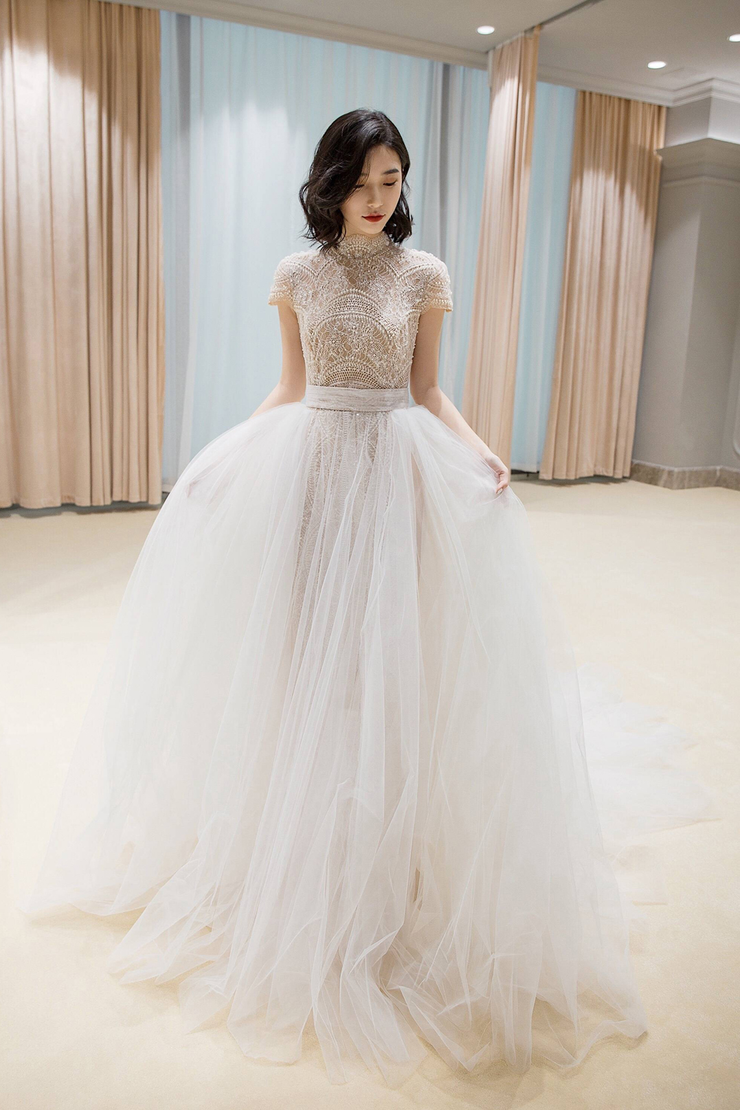 对各种身材都极为友好的高腰蓬裙, 将品牌标志性蕾丝花纹排列重组,使其更贴合新娘的上身比例,小高领与露背结合的设计则复古俏皮。