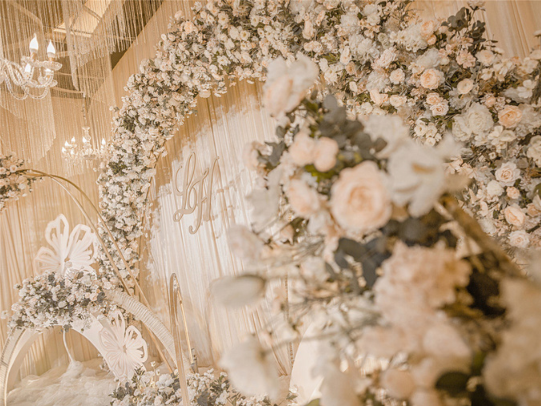 1:高清写真喷绘迎宾背景一块(3M*6M含背景桁架)/豪华布艺帷幔背景一块(3M*6M)搭配KT板造型装饰/豪华布艺帷幔(3M*4M)高清写真喷绘(3M*2M)组合背景(三选一) 2:定制精美小蝴蝶装饰1组/精美手工纸花朵(二选一) 3:欧式精美铁艺屏风和花艺装饰1套 4:欧式时尚铁艺竖琴和花艺装饰1套 5:豪华仿真铁艺人物造型和花艺装饰1组 6:豪华罗马柱2个含主题色花艺装饰 7:设计师设计专属迎宾牌一块 8:欧式奢华相框1个 9:欧式铁艺相框架和花艺装饰 10:精美捕梦网装饰 11:精美仿真书籍装饰 12:精美欧式铁艺鸟笼装饰和花艺装饰 13:欧式布艺甜品桌布置