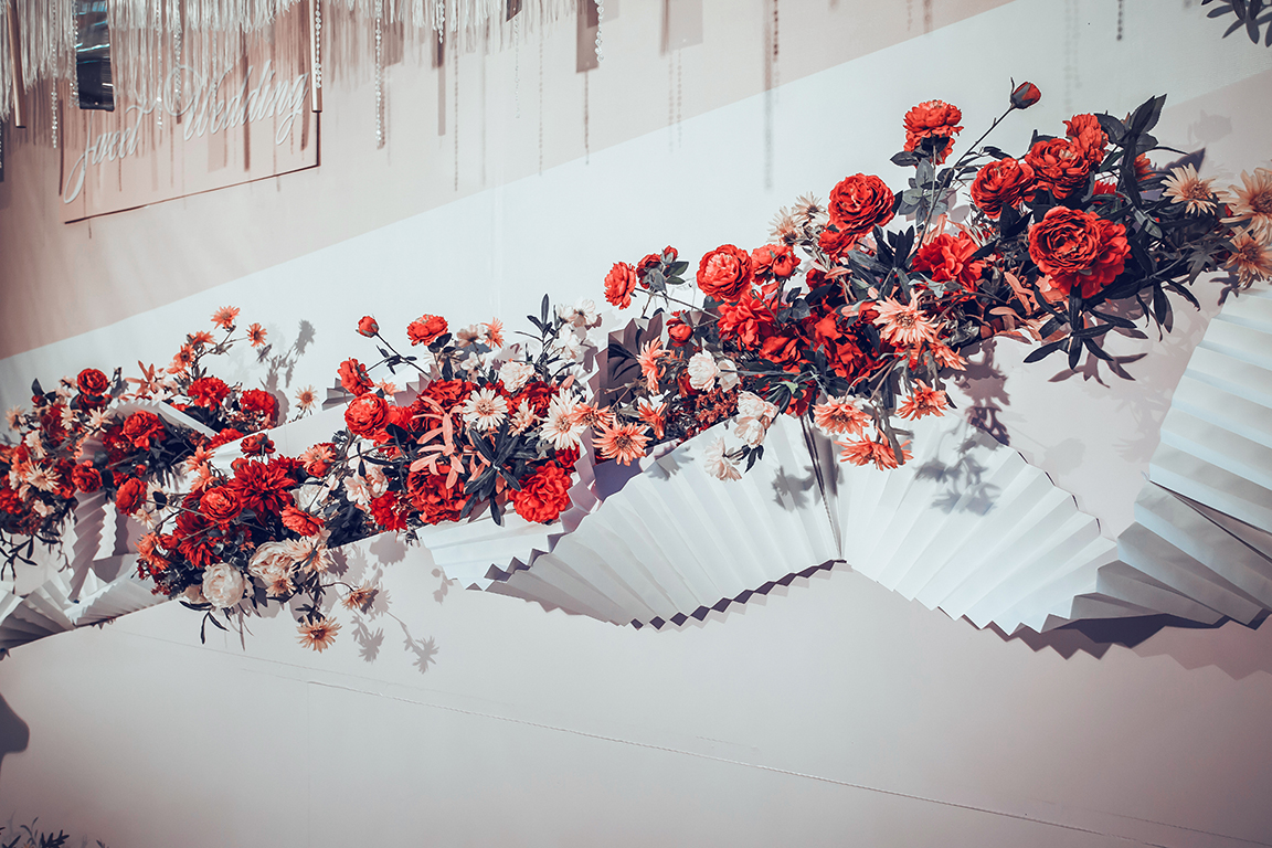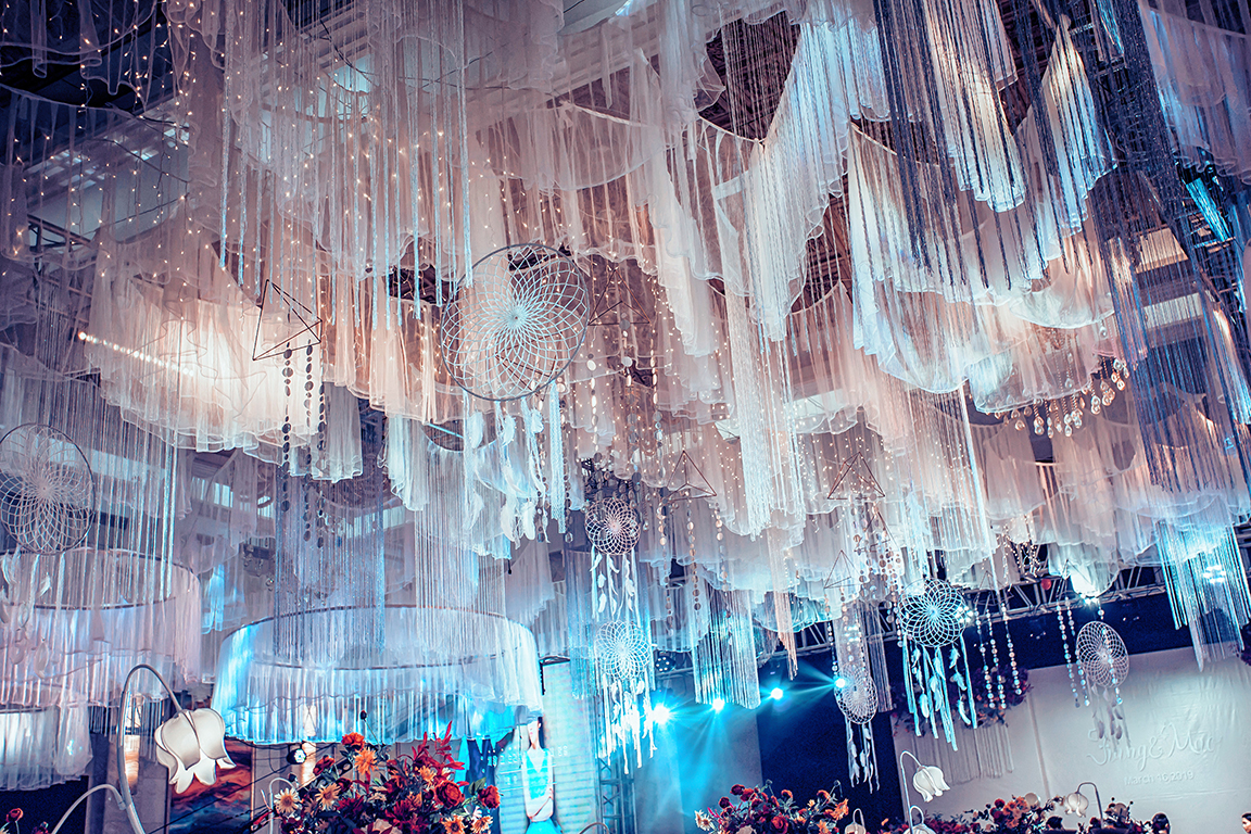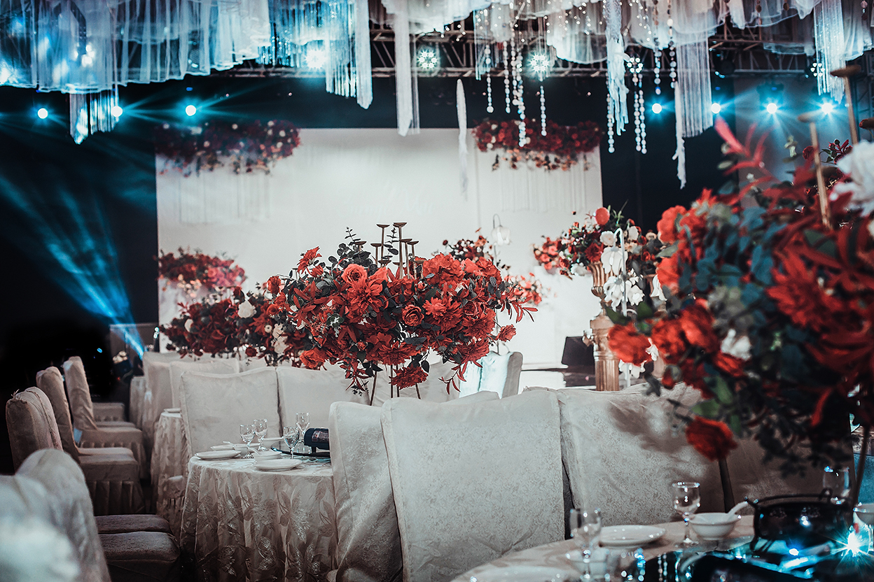 层次分明的纯色背景,加上繁花营造的泰式花艺 整体简单大气,更能突出舞台上的新人