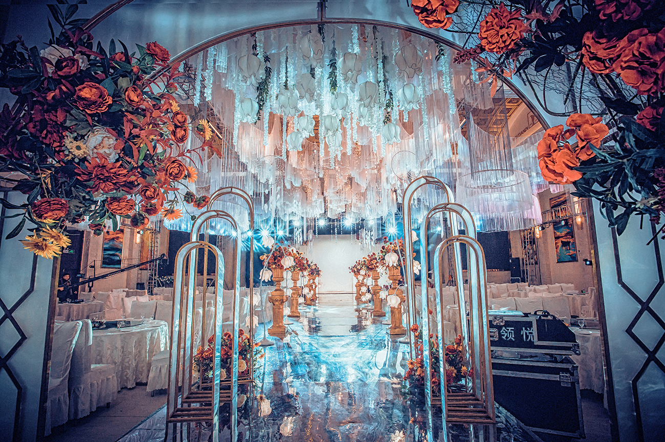 1.仪式亭主题设计造景 2.仪式区精致花艺造型 3.现场精致路引道具
