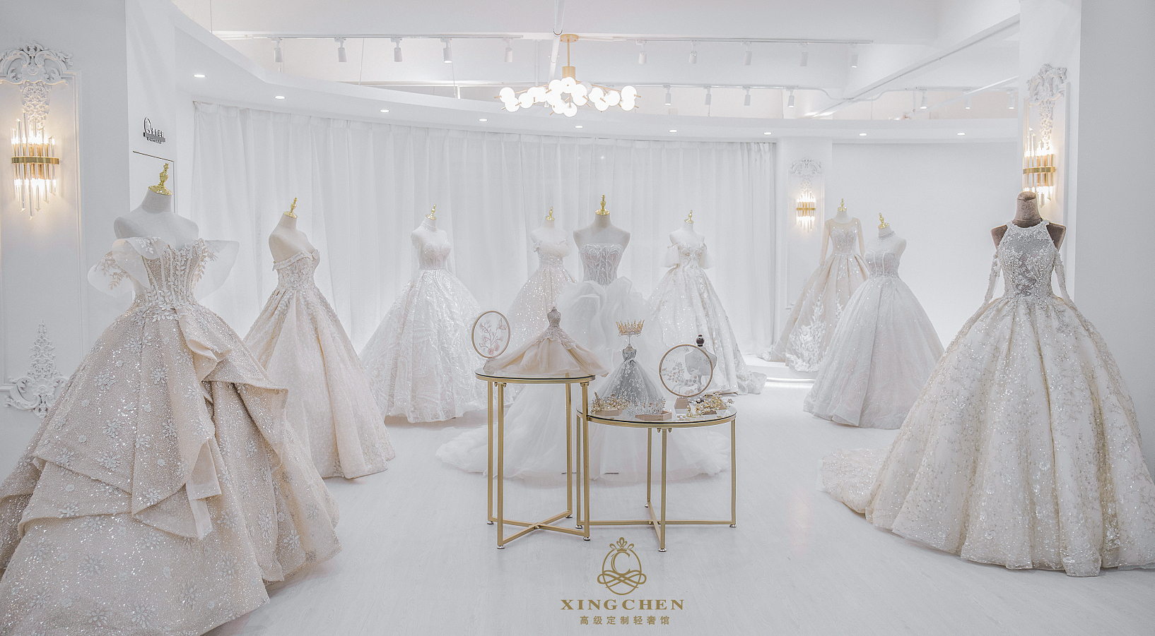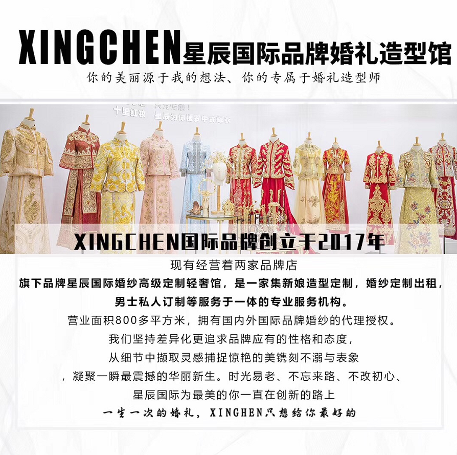 星辰国际国内一线品牌区婚纱套餐 1.品牌仪式主纱任选一件 2.品牌迎宾纱任选一件 3.品牌龙凤褂任选一套 (另赠送首席化妆师全程跟妆+婚宴当天送妈妈妆、新郎妆!)