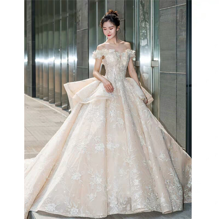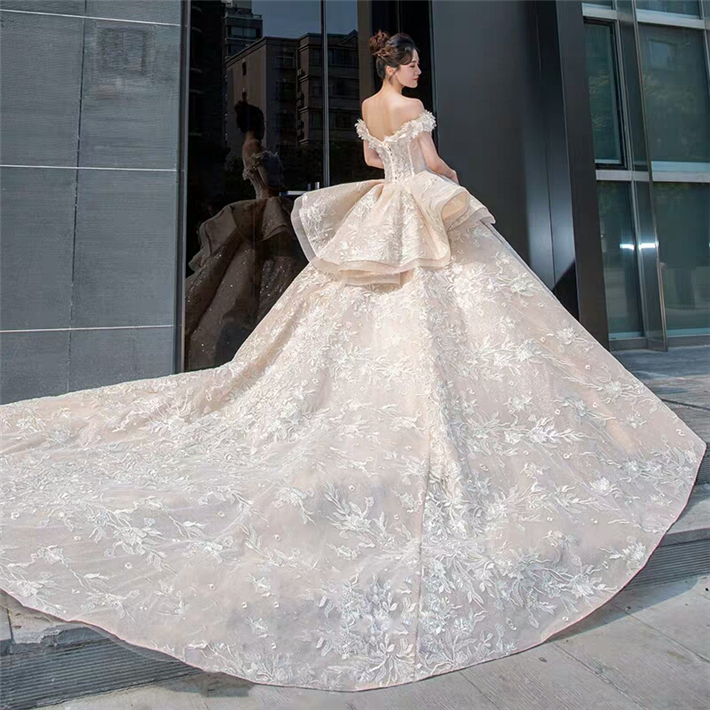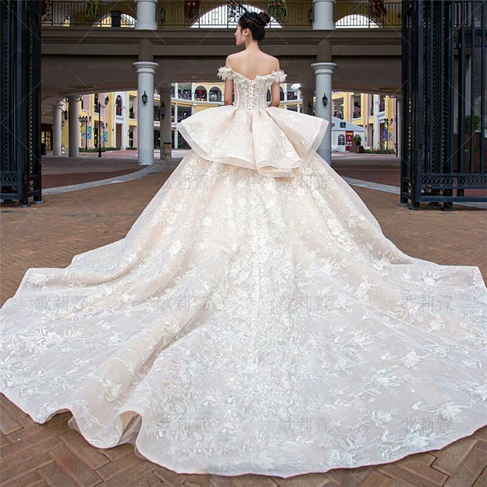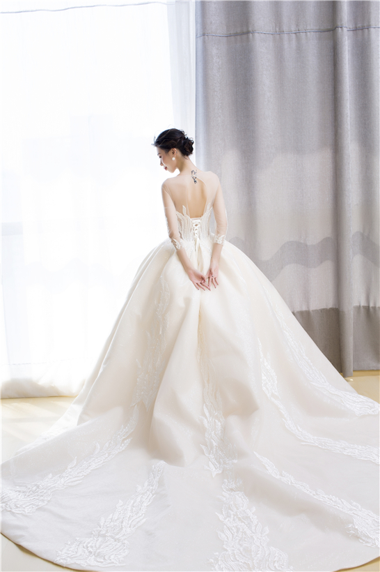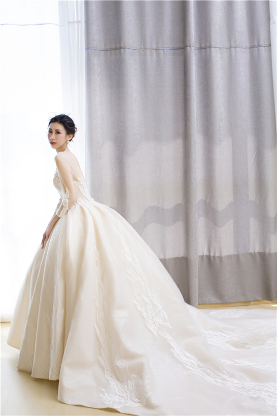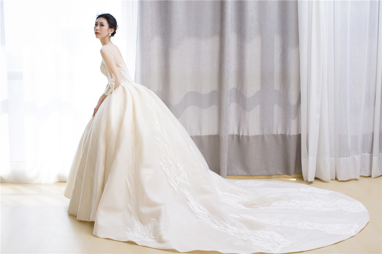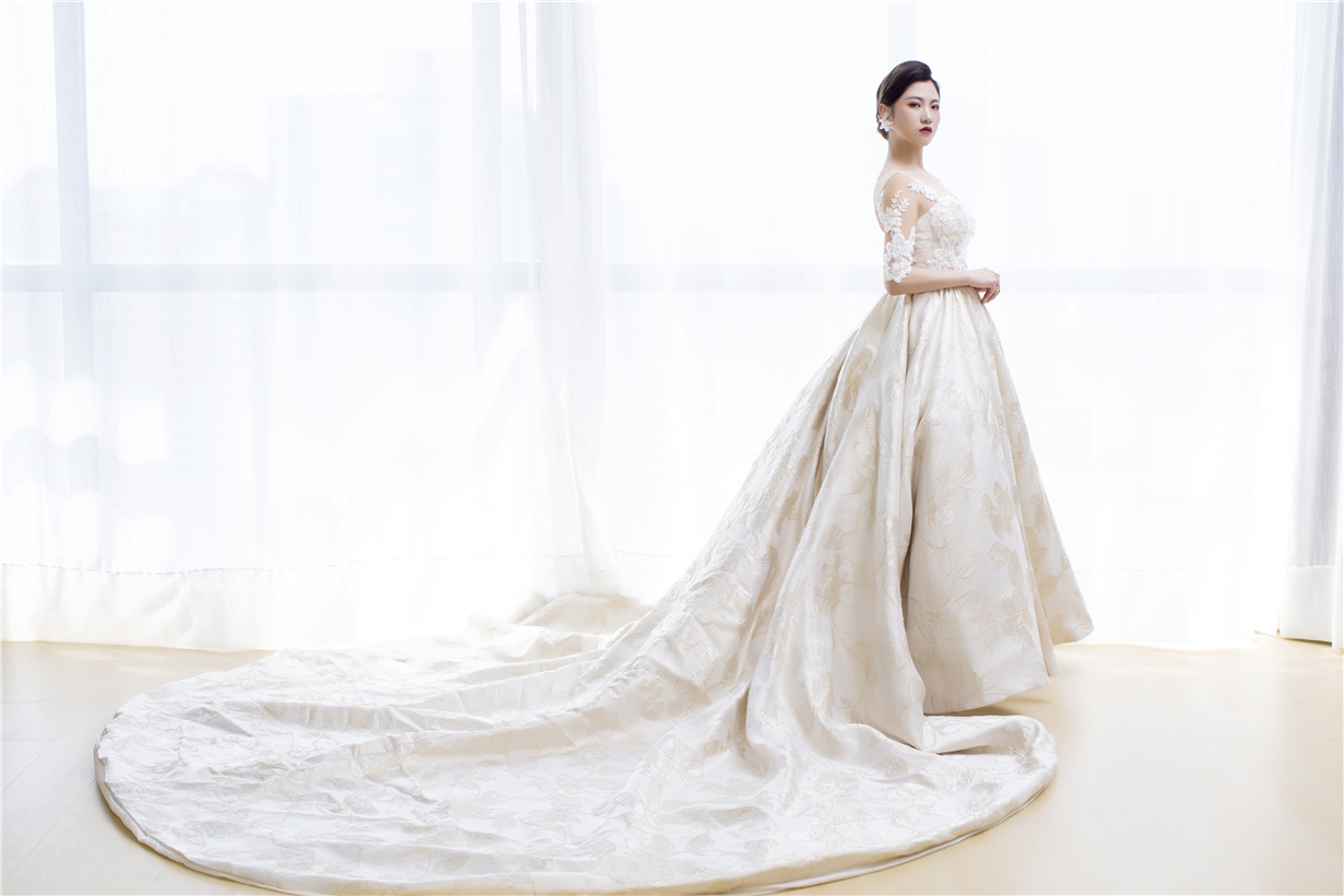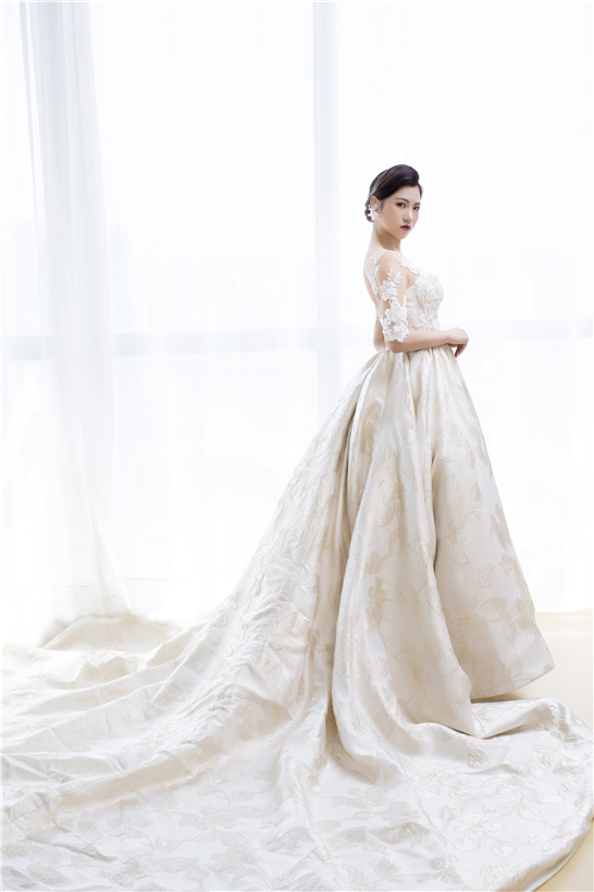 此款婚纱整体设计风格以欧式宫廷感为主线,采用进口丝织缎,利用特殊工艺处理,全身立体浮雕花带来不一般的奢华感。婚纱的颜色是白、香槟、金三色的糅合,尽显大气之风,如果你的婚礼仪式场地比较大,那么这款一定是能hold住全场的主婚纱!