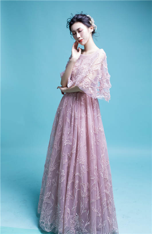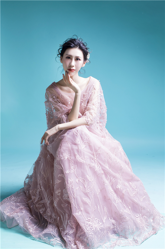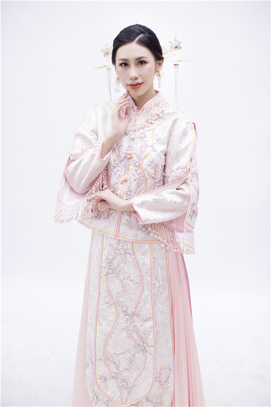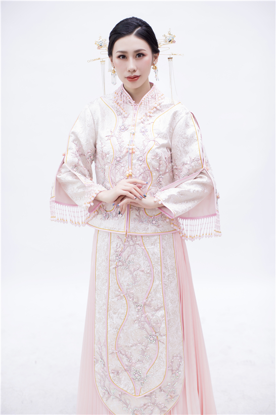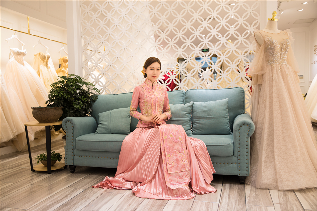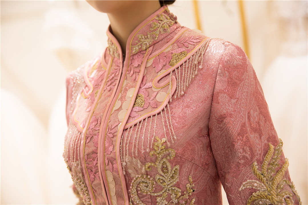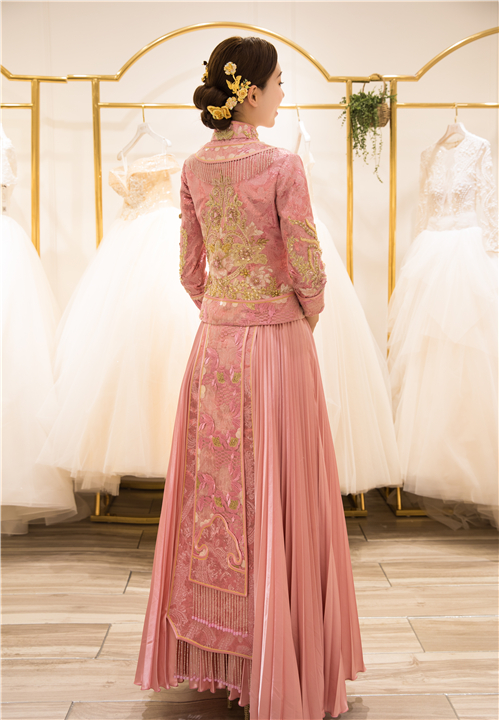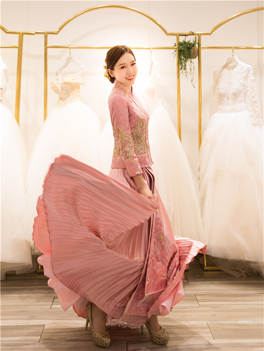 一袭粉色纯手工刺绣秀禾,将妙龄女子的灵秀婉约演绎得淋漓尽致,较之红色,尽显少女情怀。
