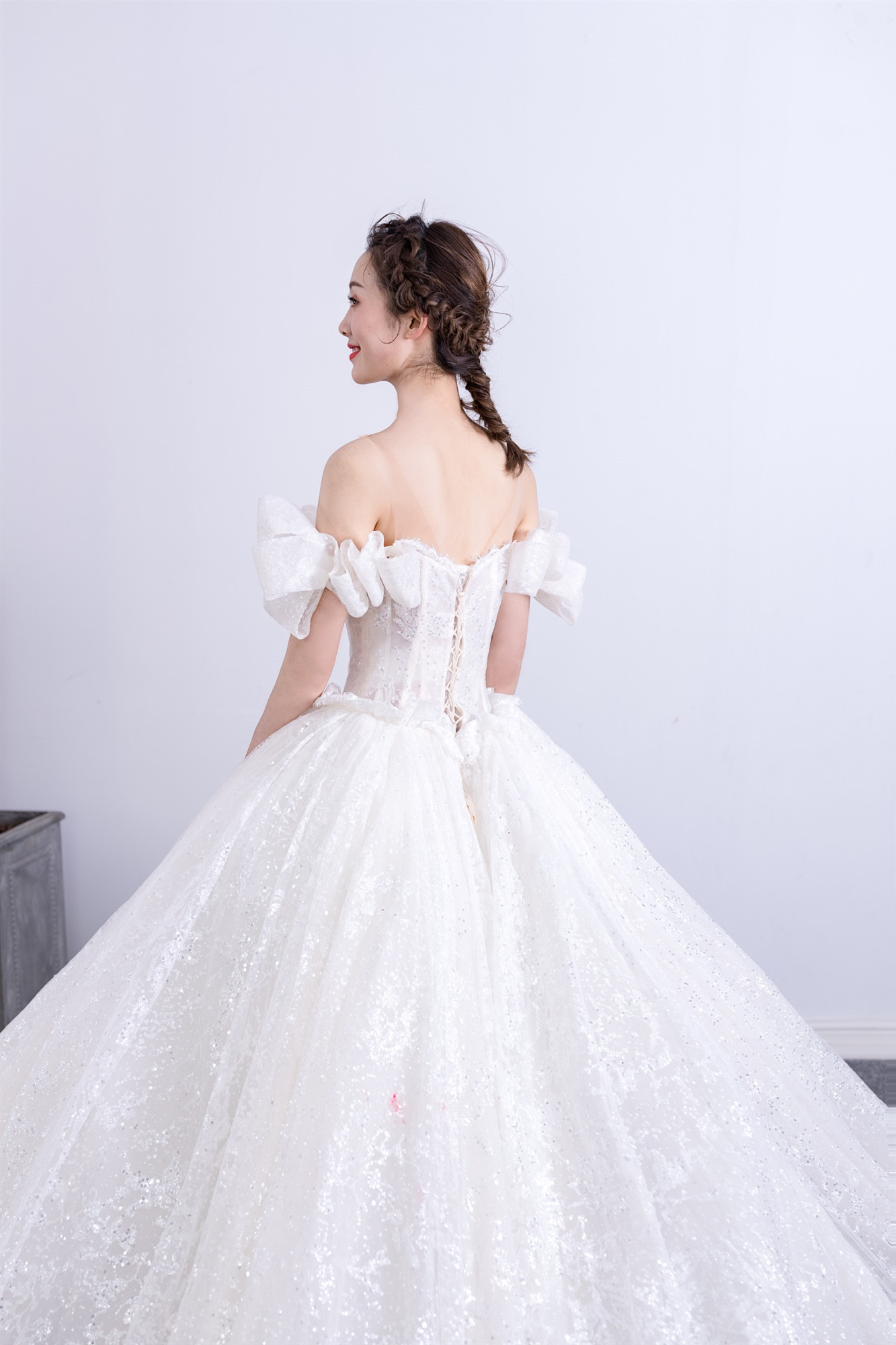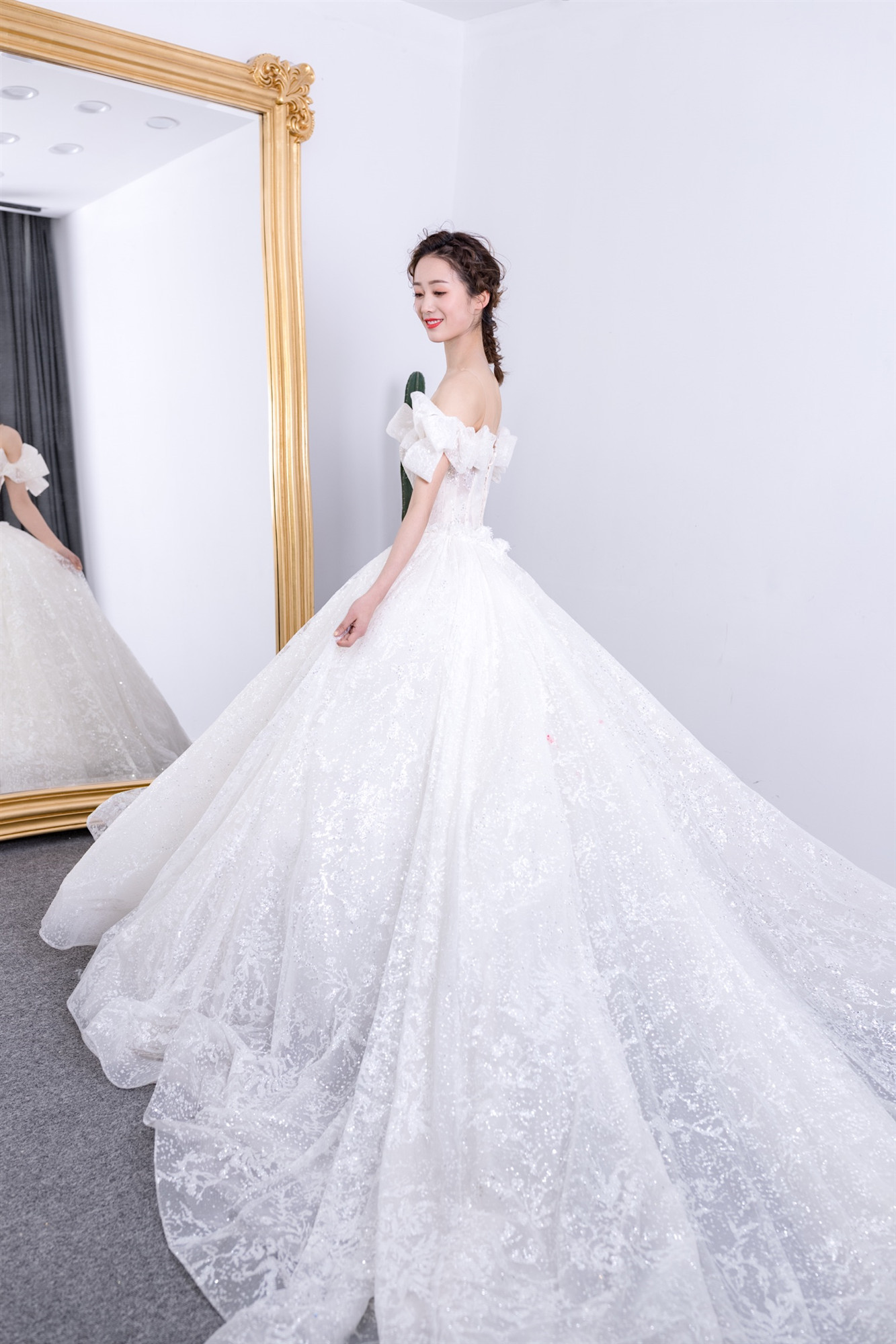 最初的公主梦,一字肩蝴蝶袖,蓬蓬的拖尾裙,甜美蝴蝶结全部都是对最初的幻想
