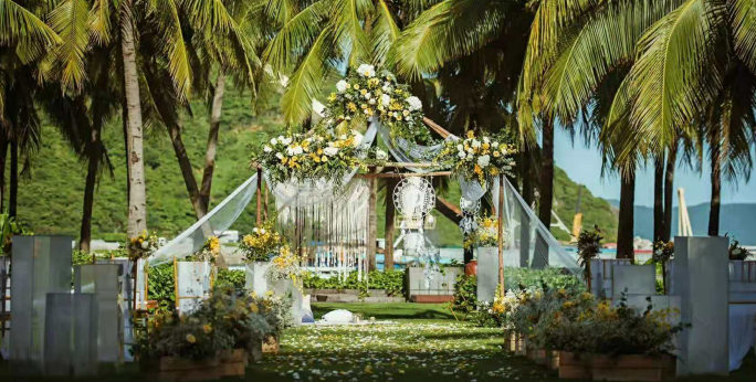 花艺的颜色可以根据新人想法来设定,不一定要是图片上的固定颜色,会是鲜花和高仿绢花的混合使用,让整体花艺更灵动