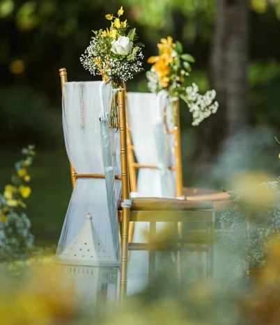 主背景用木质树干搭成“家”的样子,白色挂毯、抱枕等装饰使整体看起来很温馨,花艺的空间装饰让整个背景看起来更完整,白色纱质纱幔在视觉上感觉整体更长,扩大背景的效果;木质盒子搭配花艺为路引,总共8个;50把白色竹节椅搭配白色纱质装饰