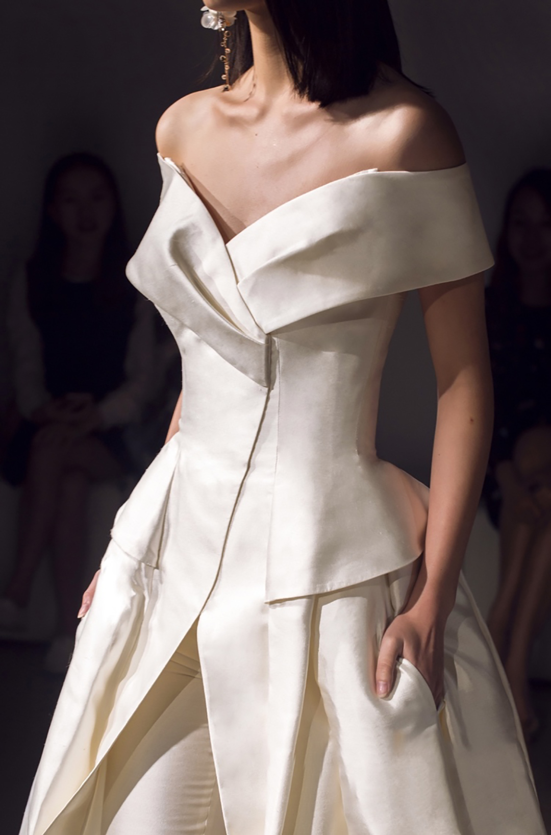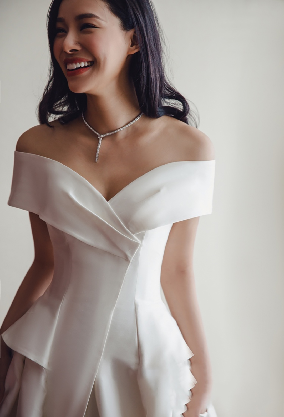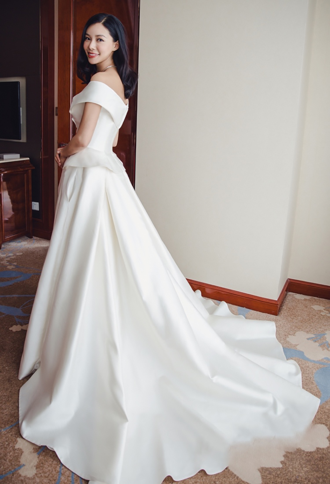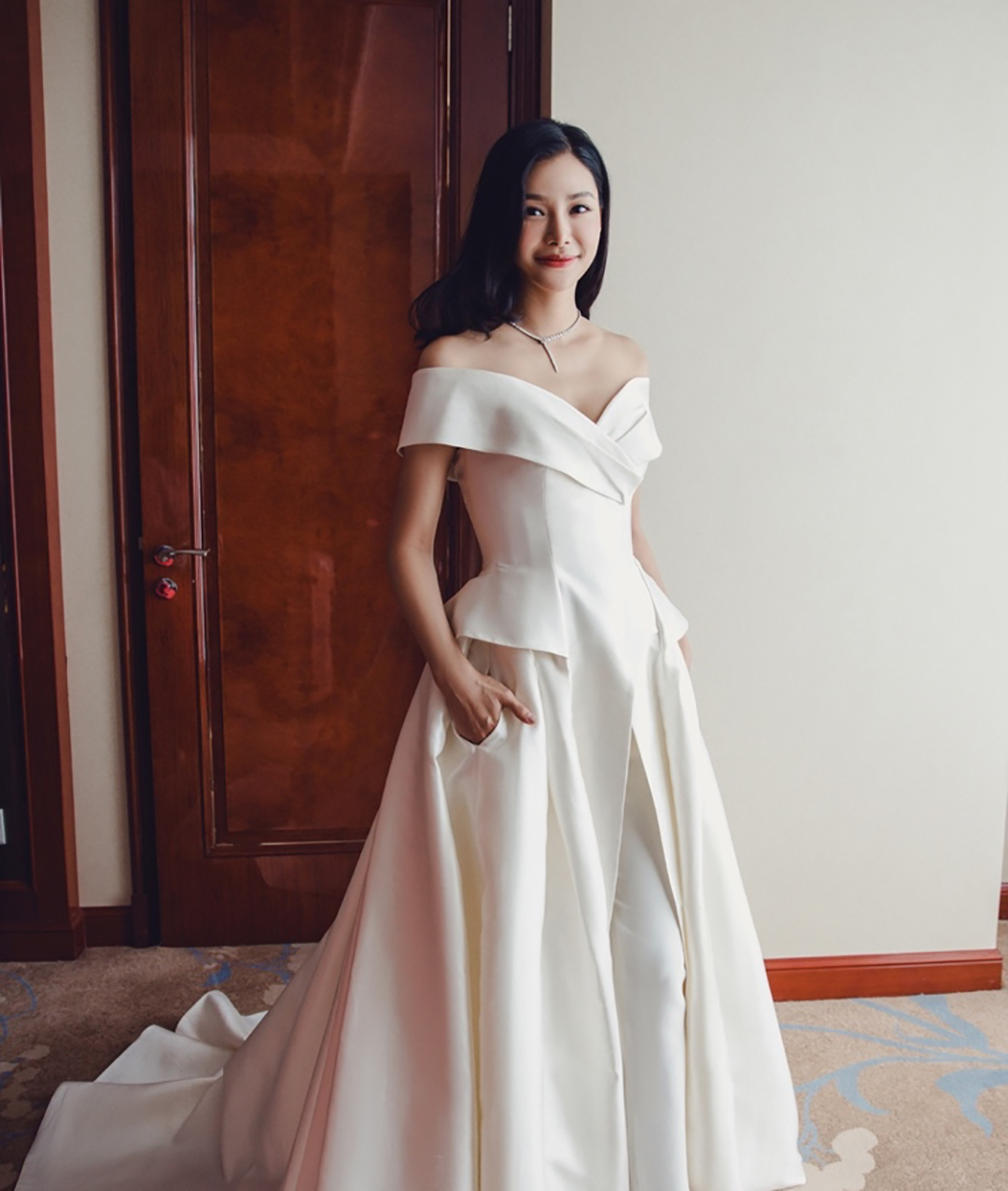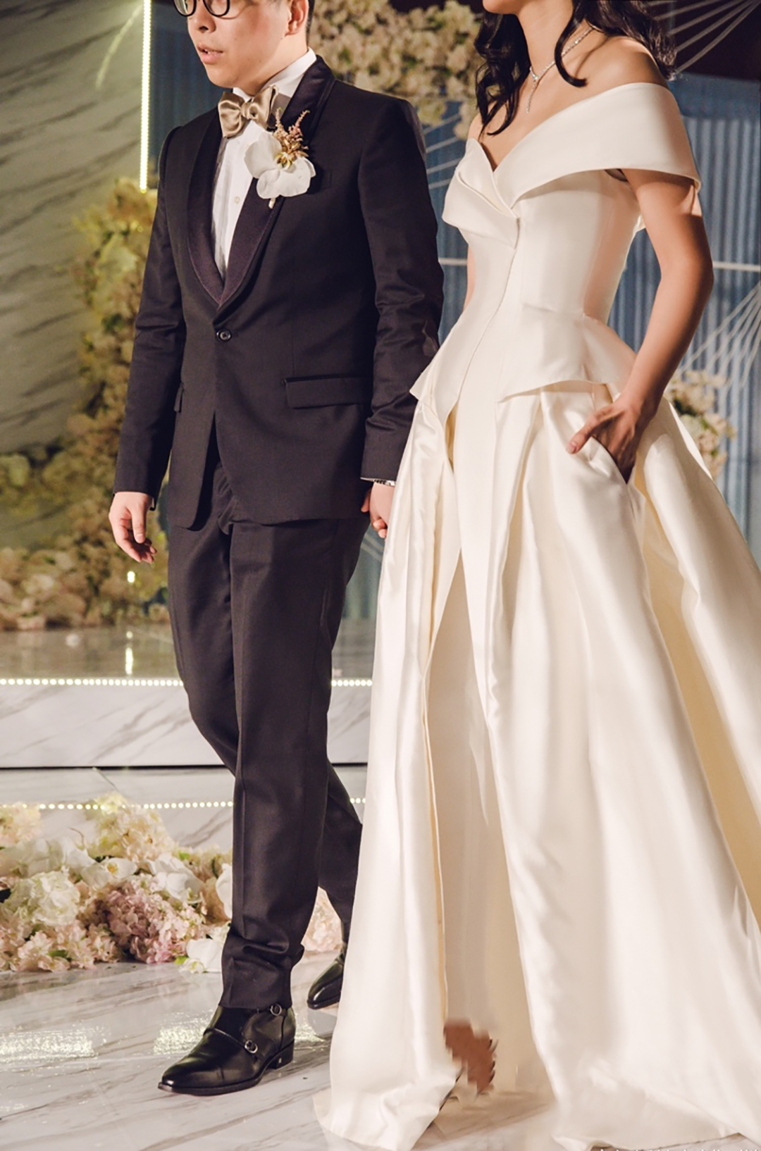 长沙天鹅婚纱礼服 时尚缎面一字裤大拖尾婚纱礼服