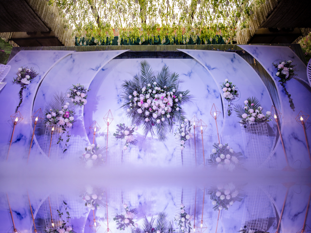 【现场布置】 1、舞台背景布置(30立体素材搭建) (不含空顶) 2、通道区T台搭建+反光板 3、主题婚礼仪式区布置(含花艺) 4、精美主席花(一束) 5、迎宾区180海报(一张),加照片kt板两张(画架) 6、精致路引6个