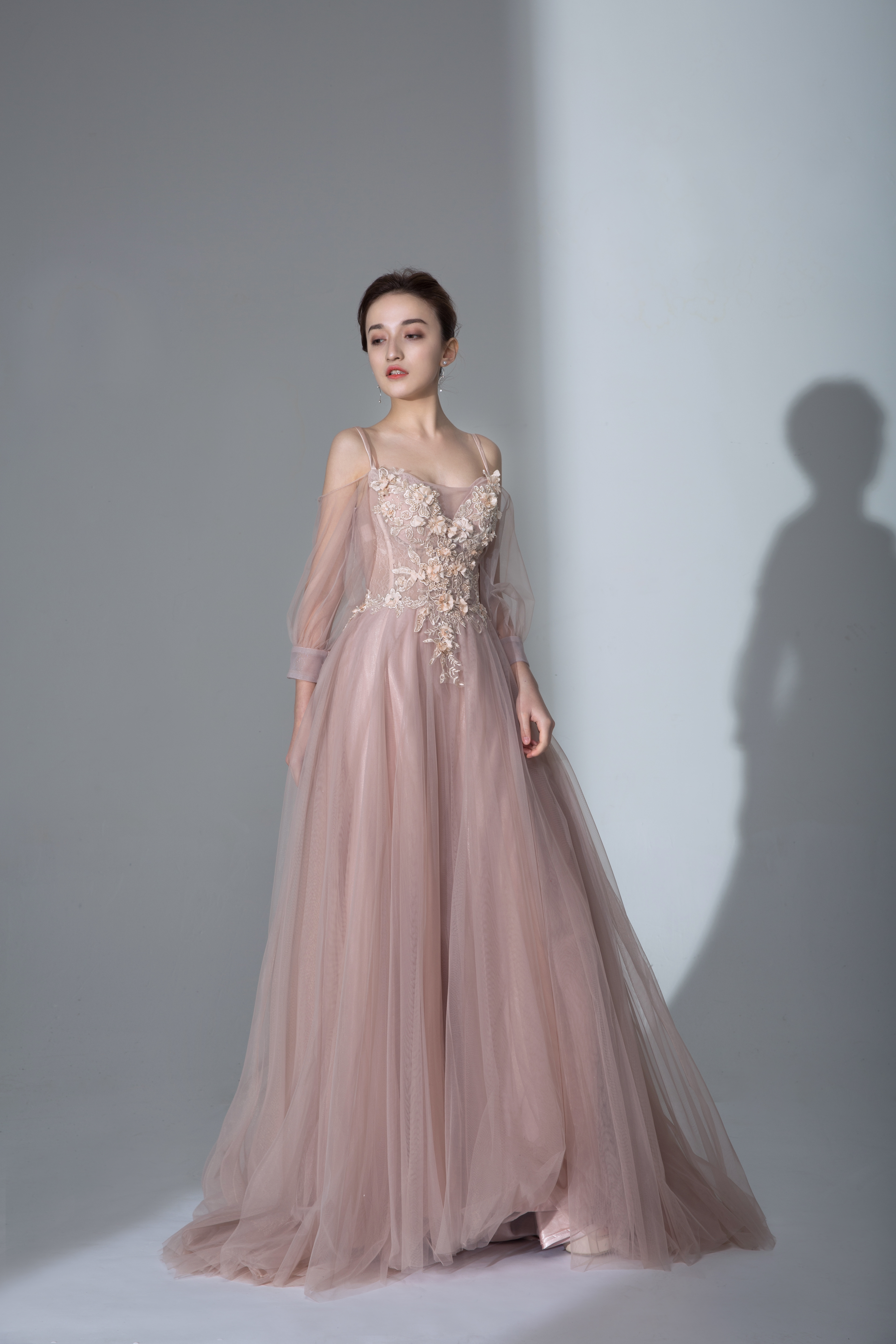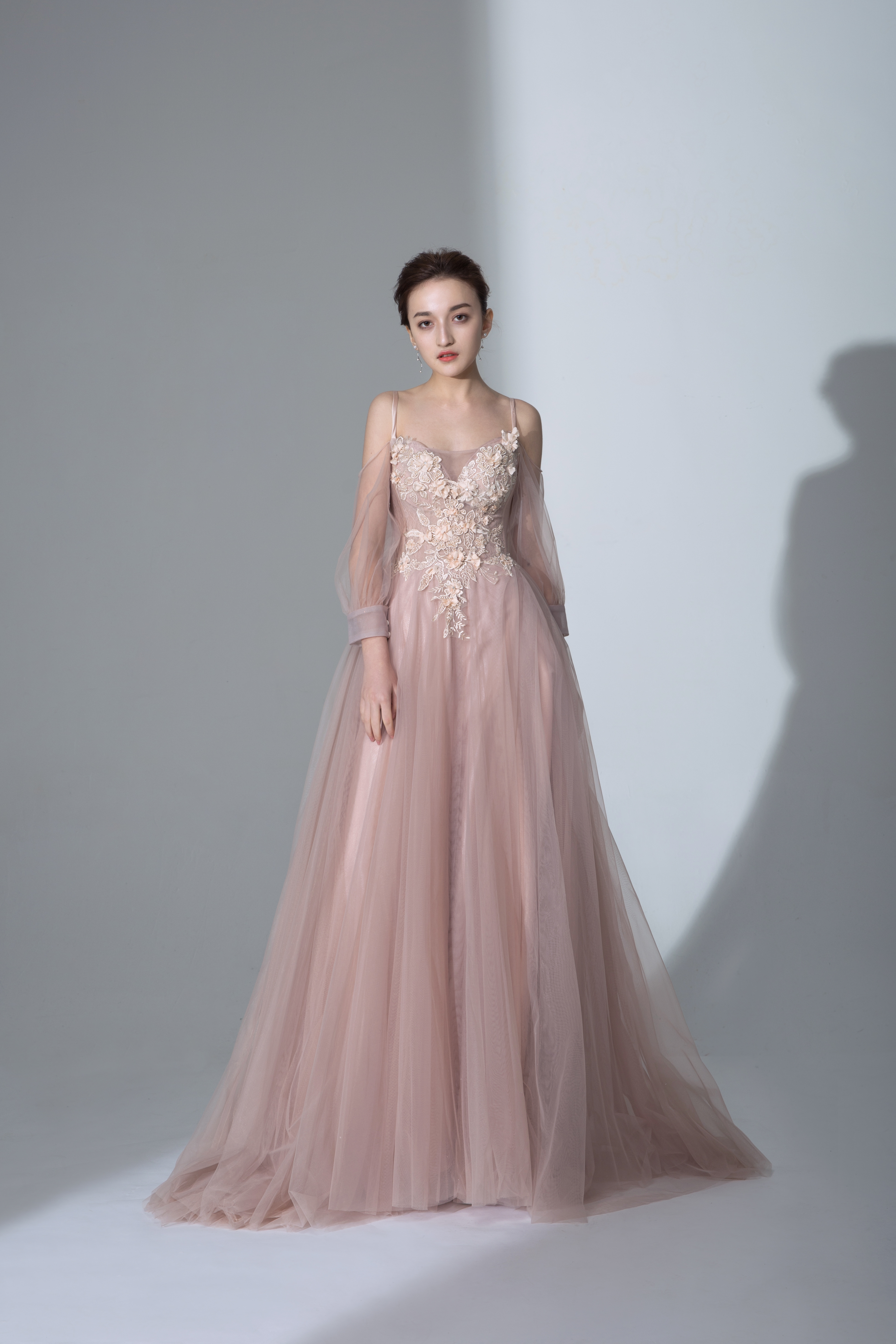 纱质轻柔,呈现高级的奶白色,打造的效果清逸飘渺。