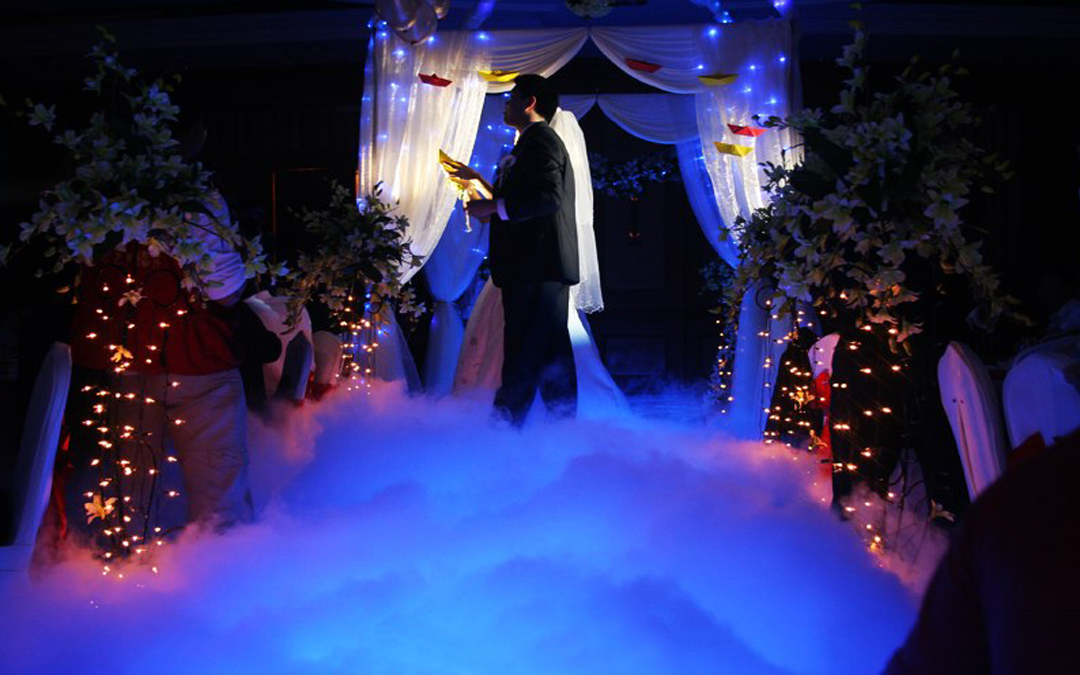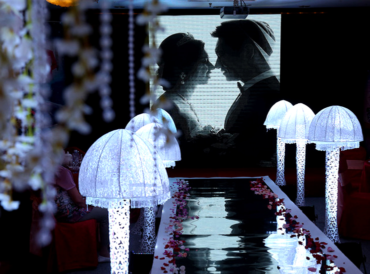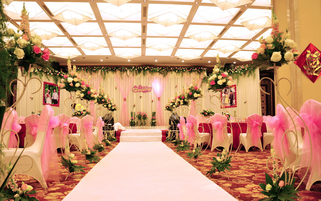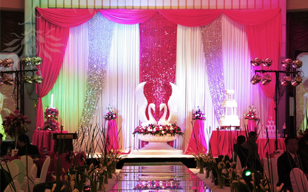 纯色背景、幔头装饰、彩缎带造型、亮片金银帘装饰、灯光装饰、wedding发光字牌