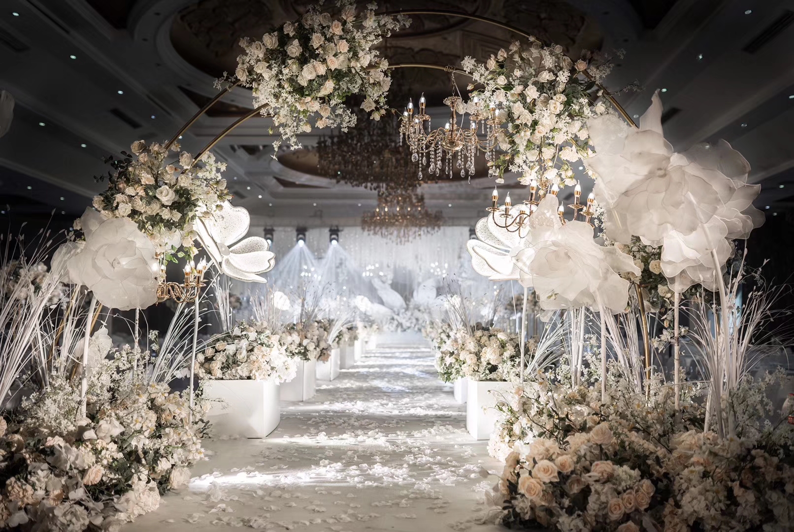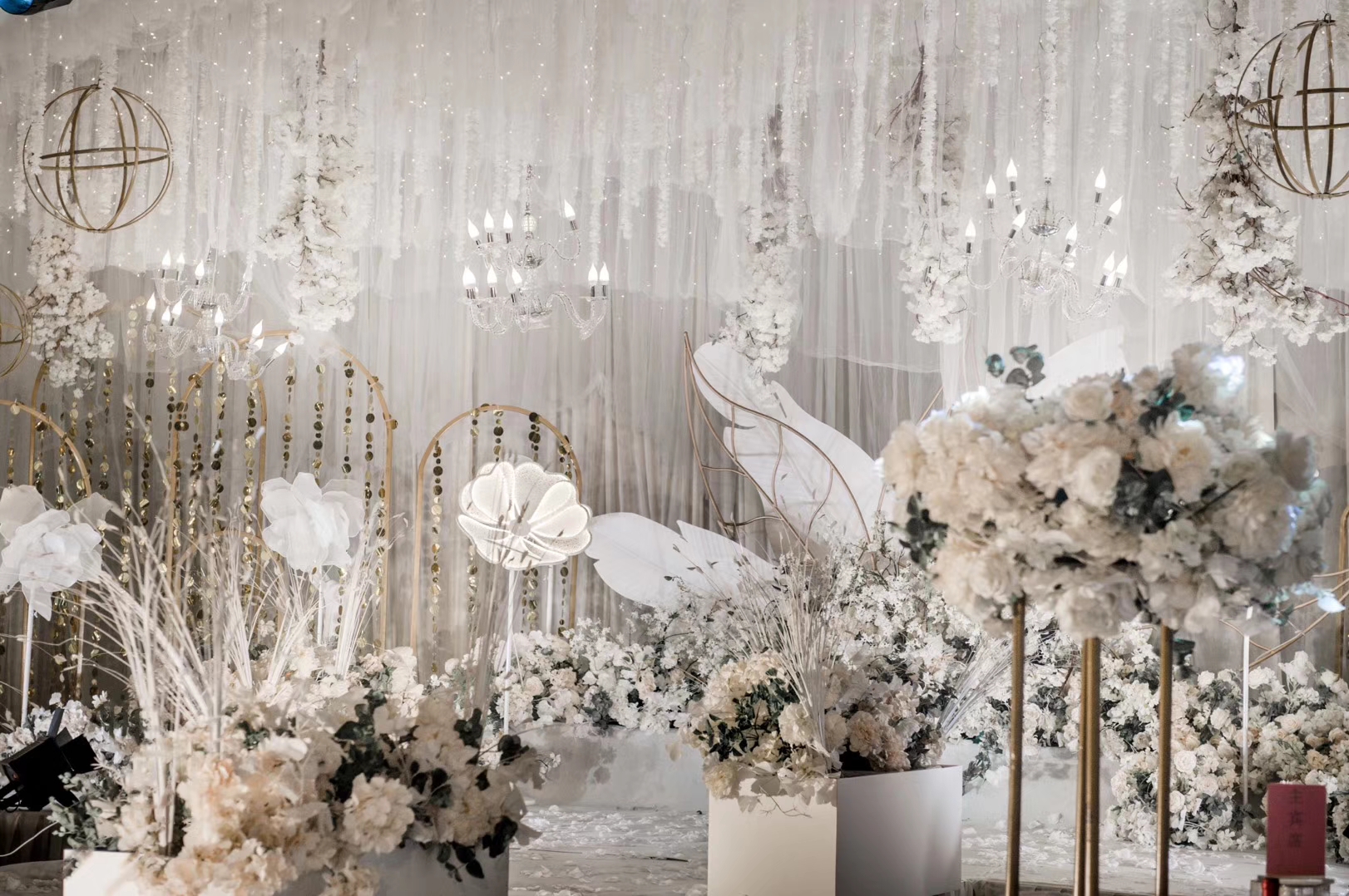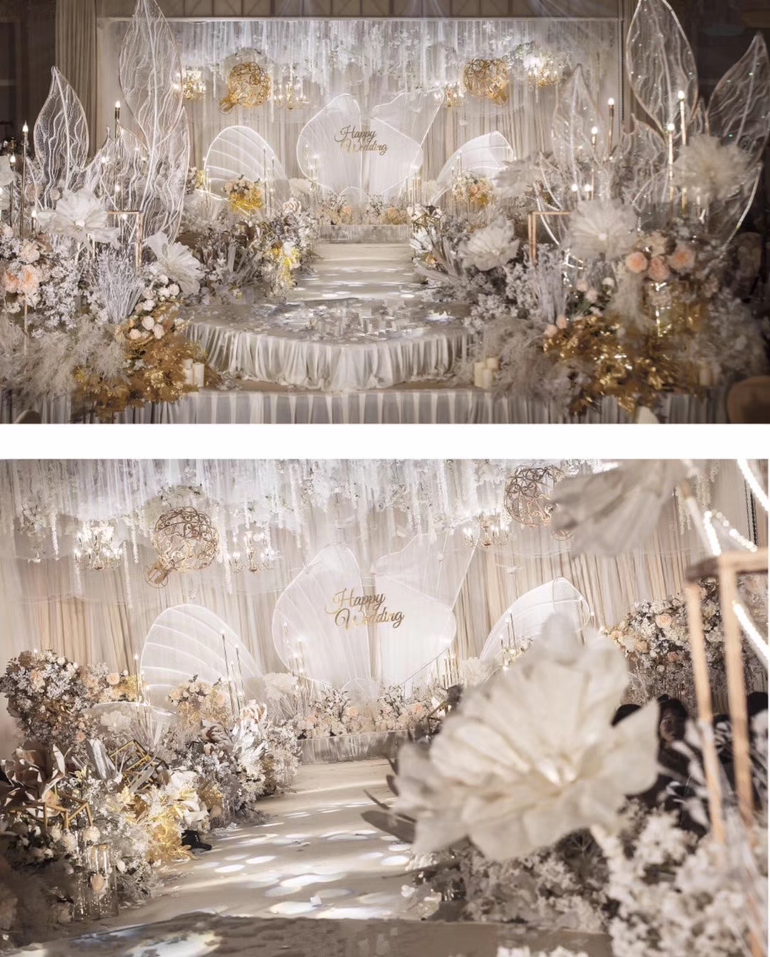 花艺使用白色+香槟色,绿叶点缀