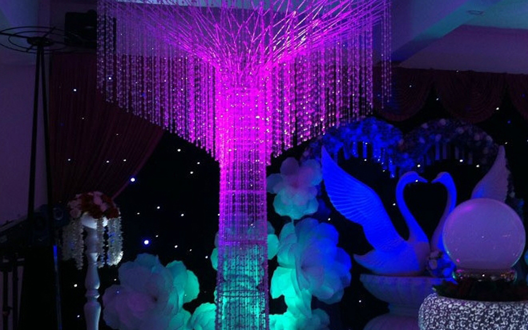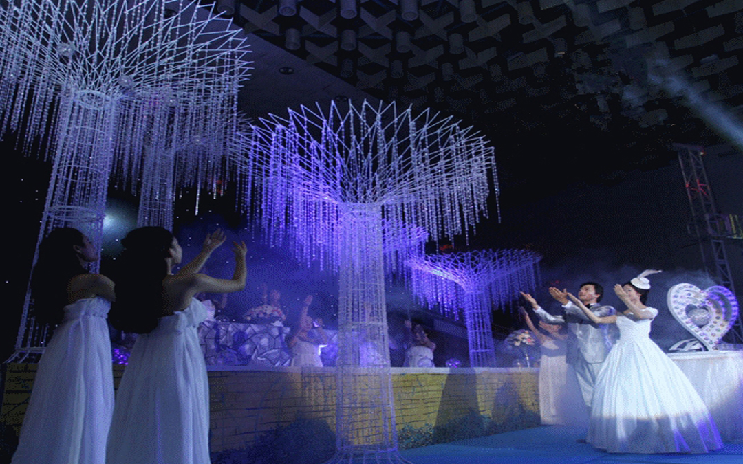 LED舞台星空幕布 1个;舞美光束灯2台(含灯光航空铝箱两个,360度旋转,渲染全场气氛) 2个;星空灿烂激光灯一台 1个;婚礼用1500W追光灯两台 (提亮舞台,最美的婚礼,最大的关注度,亮场,暗场都需要) 2个;婚礼现场用【Led par灯8台】 8个;新人入场炫丽梦幻灯光大型水晶树两株(含梦幻灯光两组) 2个