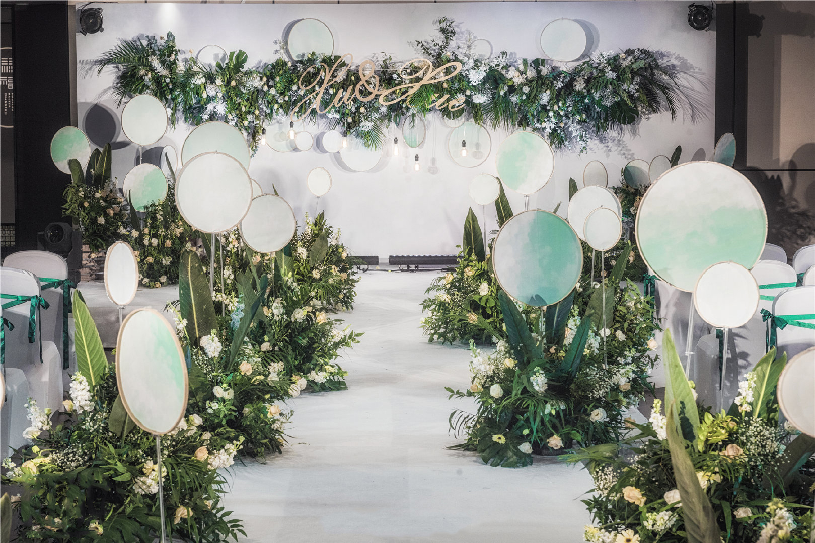 仪式区 主舞台桁架支撑框架+纱帘装饰, 主舞台背景喷绘一套(限20个平方), 主舞台金色几何铁艺+花艺设计+仿真绿植+棒棒糖道具装饰, 舞台主题色系地毯(限20平方), 定制专属婚礼主题logo+花艺设计, 搭建T台一座(限12米), 主题色系T台地毯布置, T台路引棒棒糖铁艺+仿真花艺设计 共8组, T