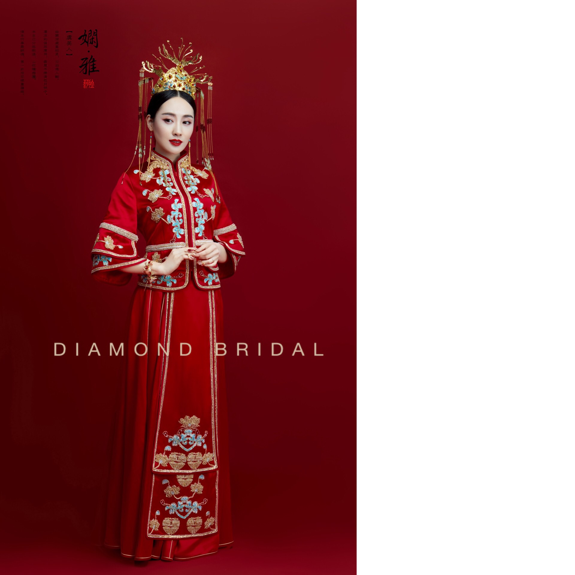 中式出门装为进口真丝面料,手绣人工贴钻,营造高雅氛围