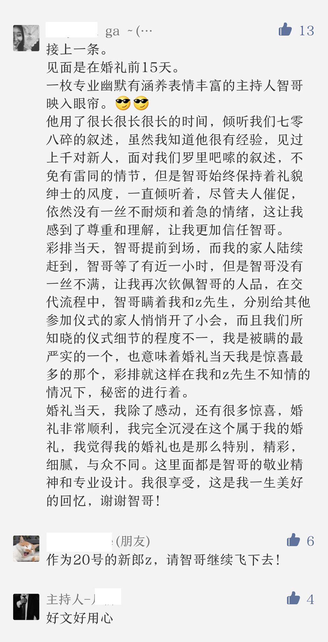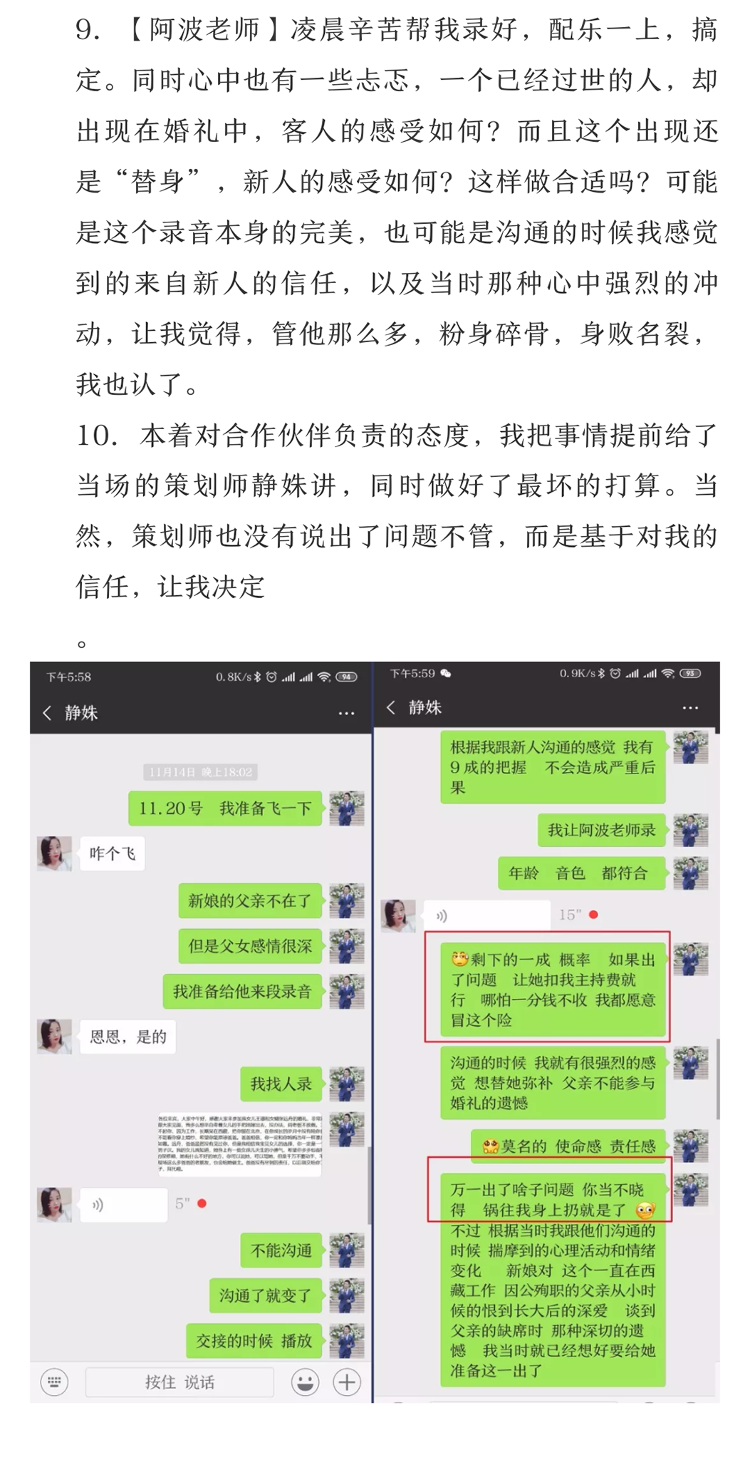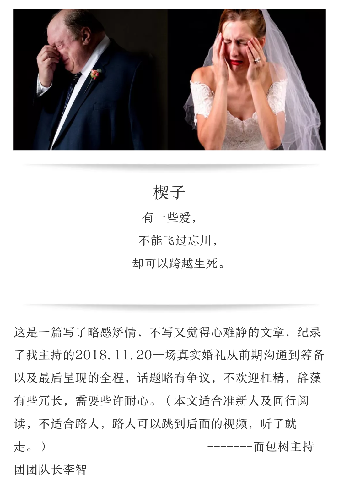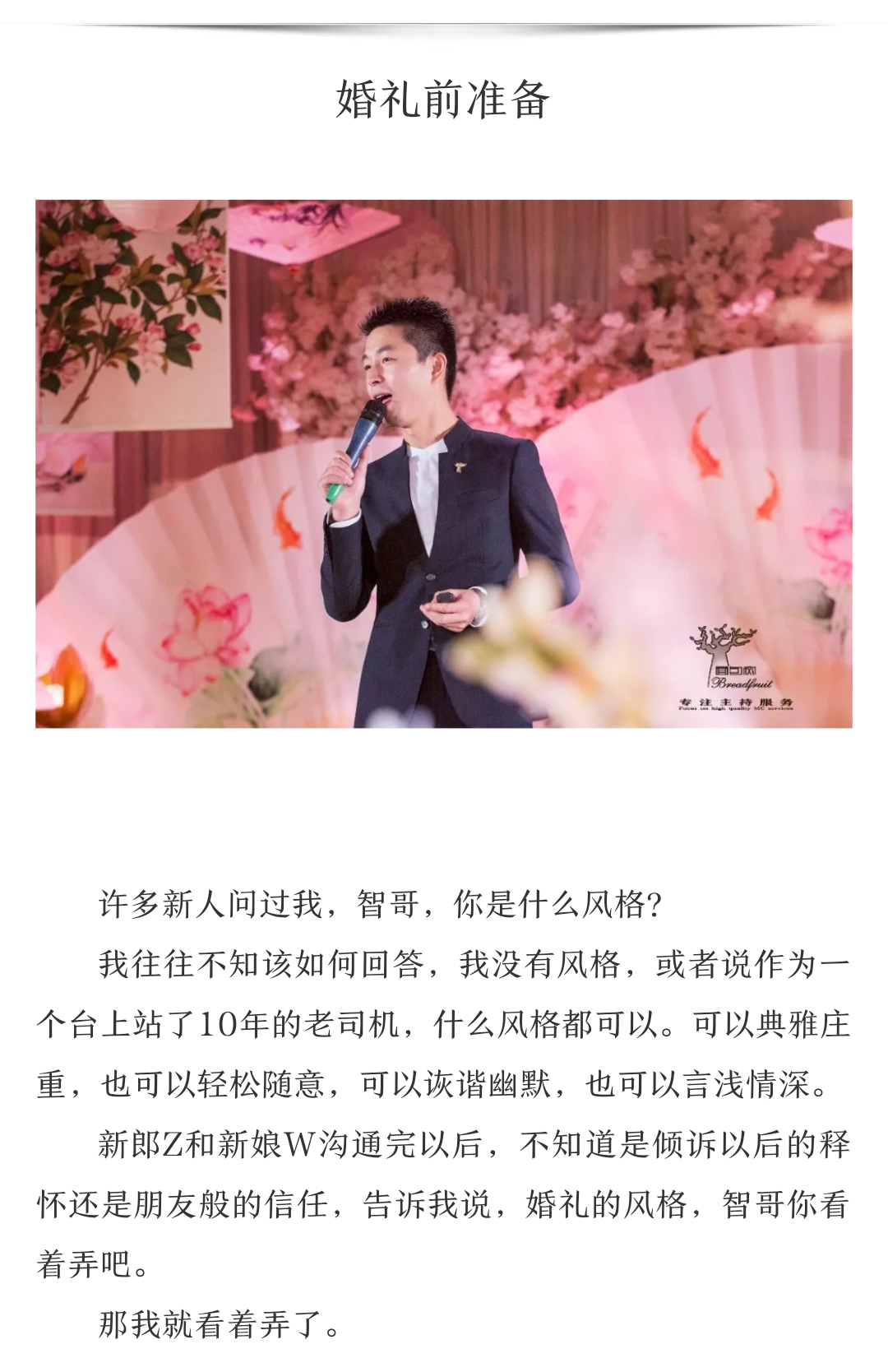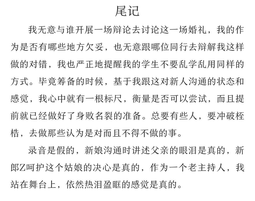 1.价格略高,新人慎选,主持为私人服务,如果一开始就因为各种原因导致互相不愉快,会严重影响服务质量。 2.工作的特殊性,定金不退,望理解。 3.如果只是想婚礼走一个形式的新人,建议不要选我,因为新人的配合度直接决定婚礼的效果。