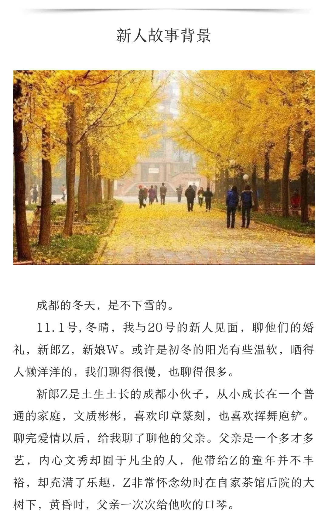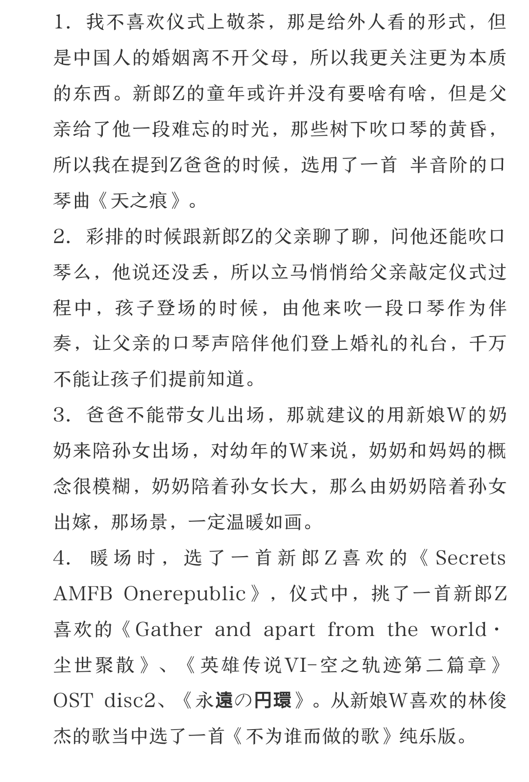 比如案例2音频:新郎新娘在丽江开客栈,平时要么跟客人聊天,要么周边闲逛。台词诗意化了大量他们生活的真实场景,音乐甄选的时候就考虑了很多云南那边的元素,鸟语花香、山歌、葫芦丝、等等。