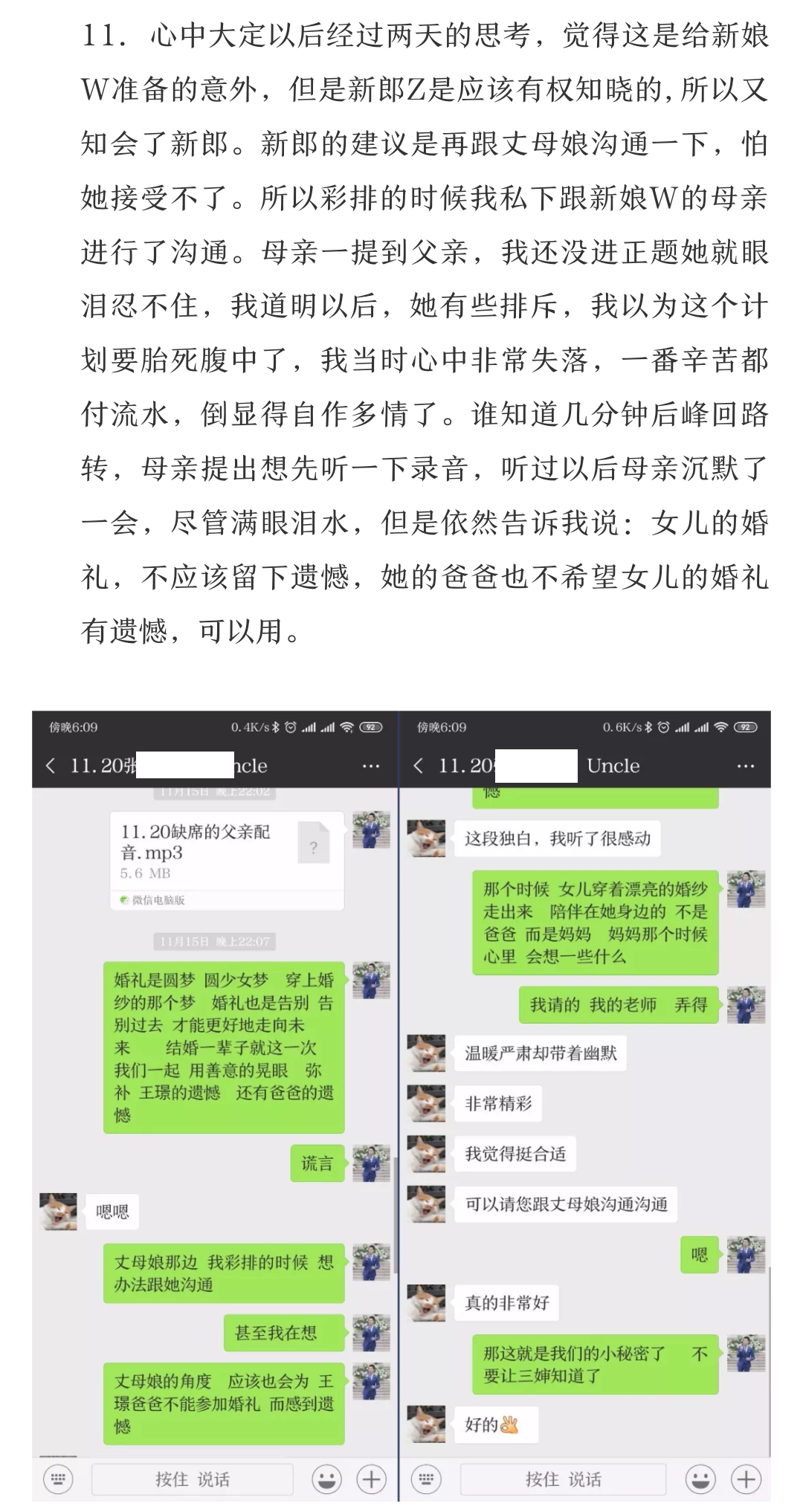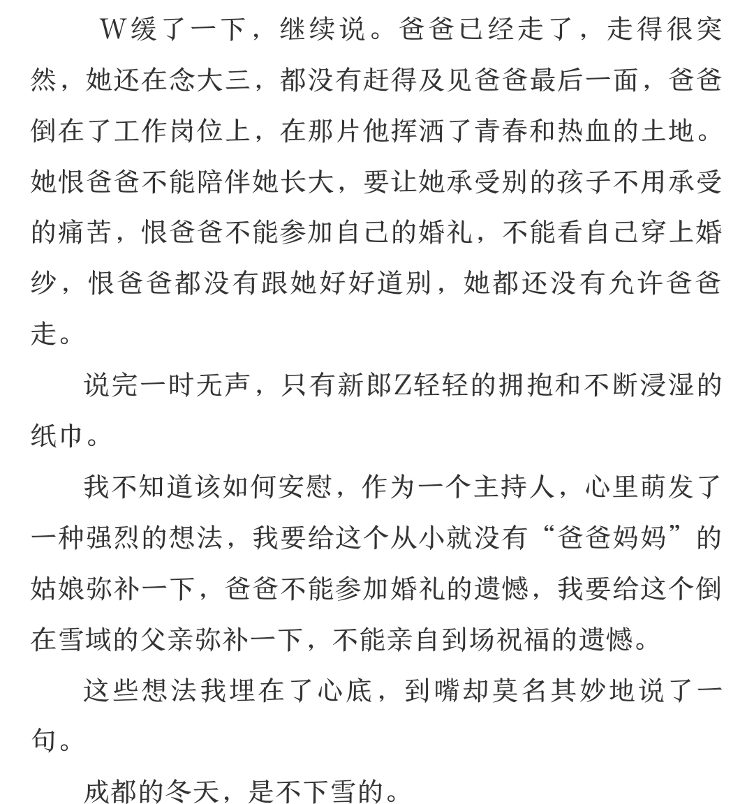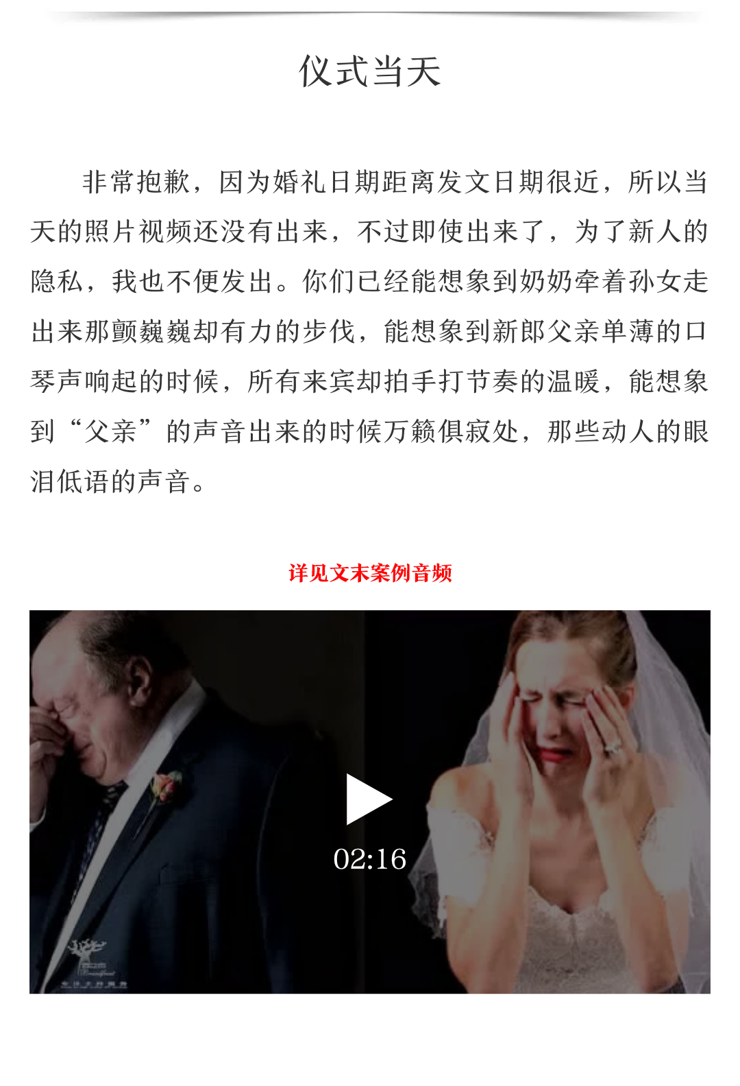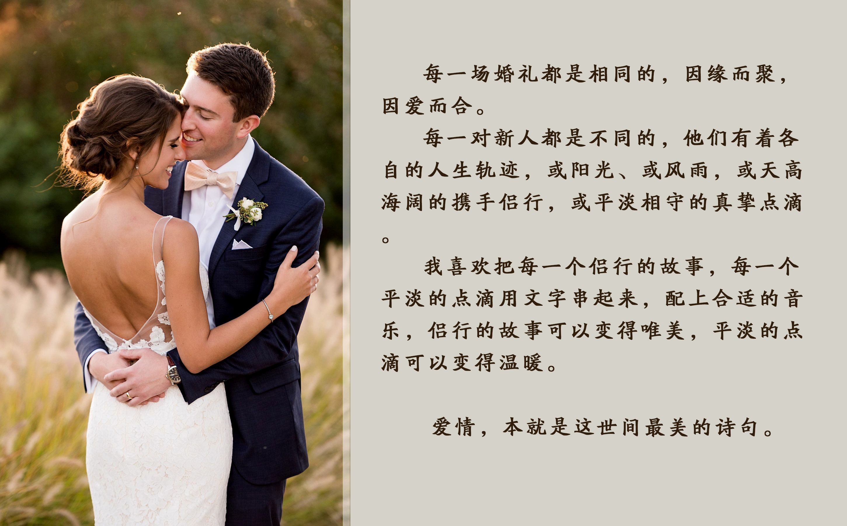 这场婚礼中的新娘在成都的各个地铁站工作很多年,一直独身一人,也是一个温婉恬美的好姑娘。所以在给她的婚礼做准备的时候,我去坐了一趟地铁,用手机录下了地铁站的的各种声音,剪辑处理以后,作为了音乐的素材。同时当她讲故事的时候我想到了孙燕姿的《遇见》,所以就把这首歌作为了主题,音效,歌词,台词合在了一起,台词即歌词,歌词即台词。片段小品,给大家听听。(见案例3)