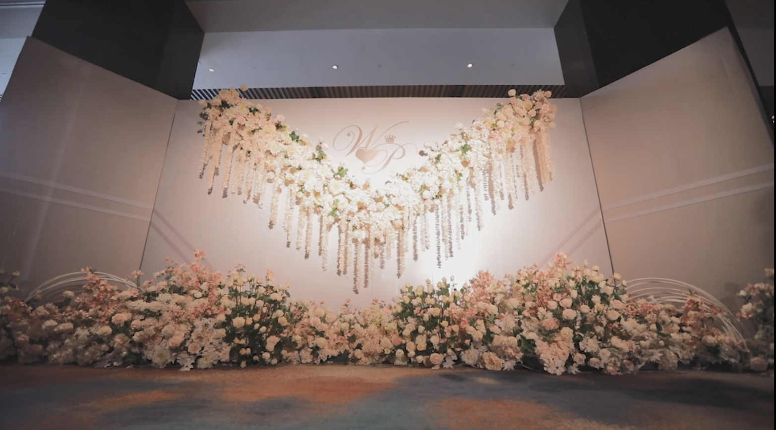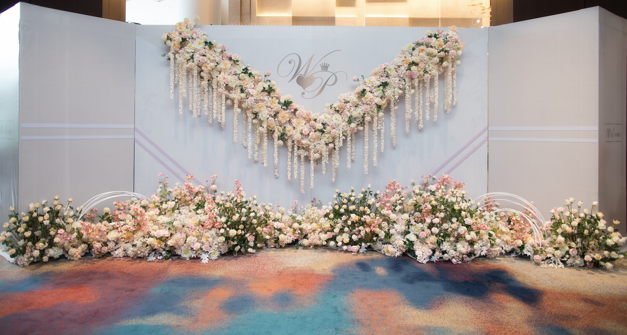 主仪式区: 采用花墙,粉色主题色系,特制新人LOGO,花墙背后用带沙的布幔打底。路引绣球打底香槟色、粉色线条花做花艺造型。