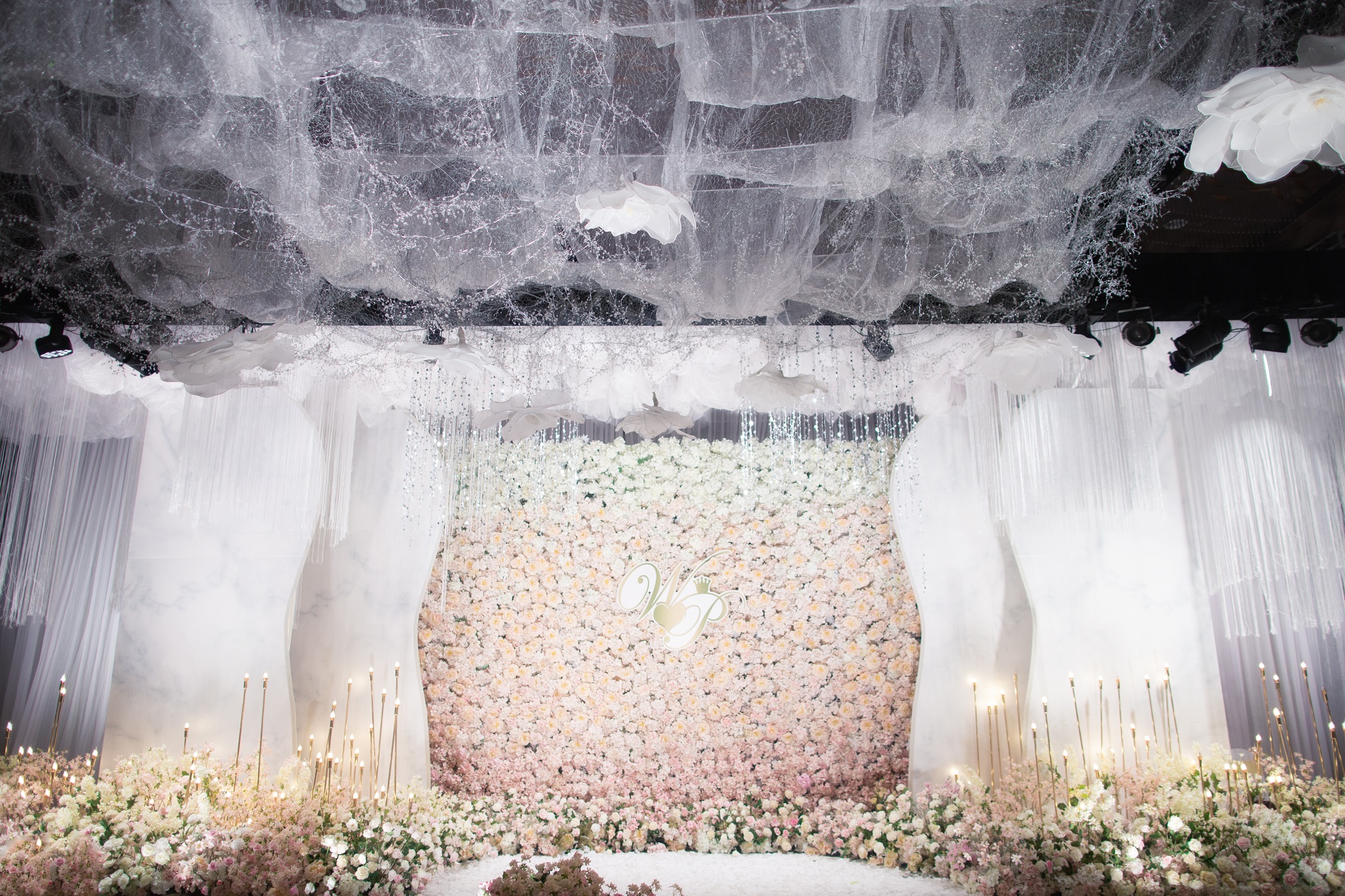 以粉色花材为主色系,以香槟色、白色 为附助色。路引一米用花材70支,花墙一平方用料100支。确保婚礼整场效果饱满。