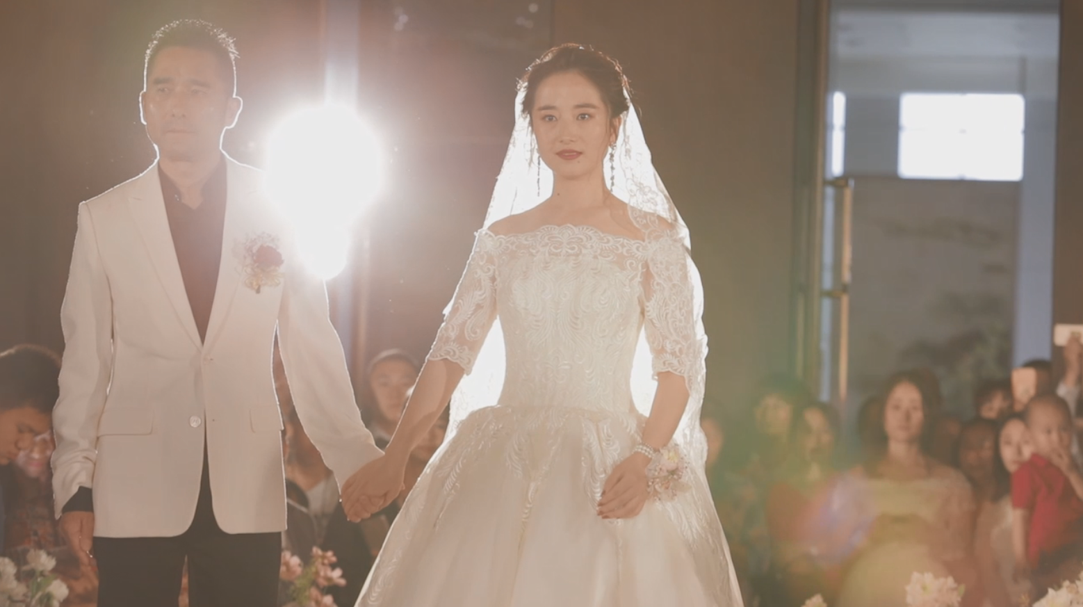 追光灯一个跟出场时的新娘, 一个跟新郎哥
