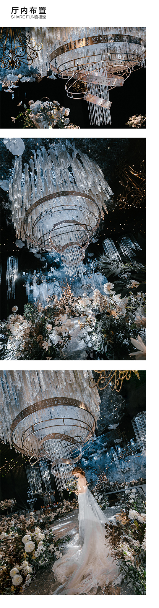 主舞台中心采用多维发散性异形铁艺装饰,由舞台中心向四周发散,使主舞台更加的赋有设计感。同时设计师更加的注重表现材料的质感和光泽,使其更好的融入这场气质满满的婚礼。