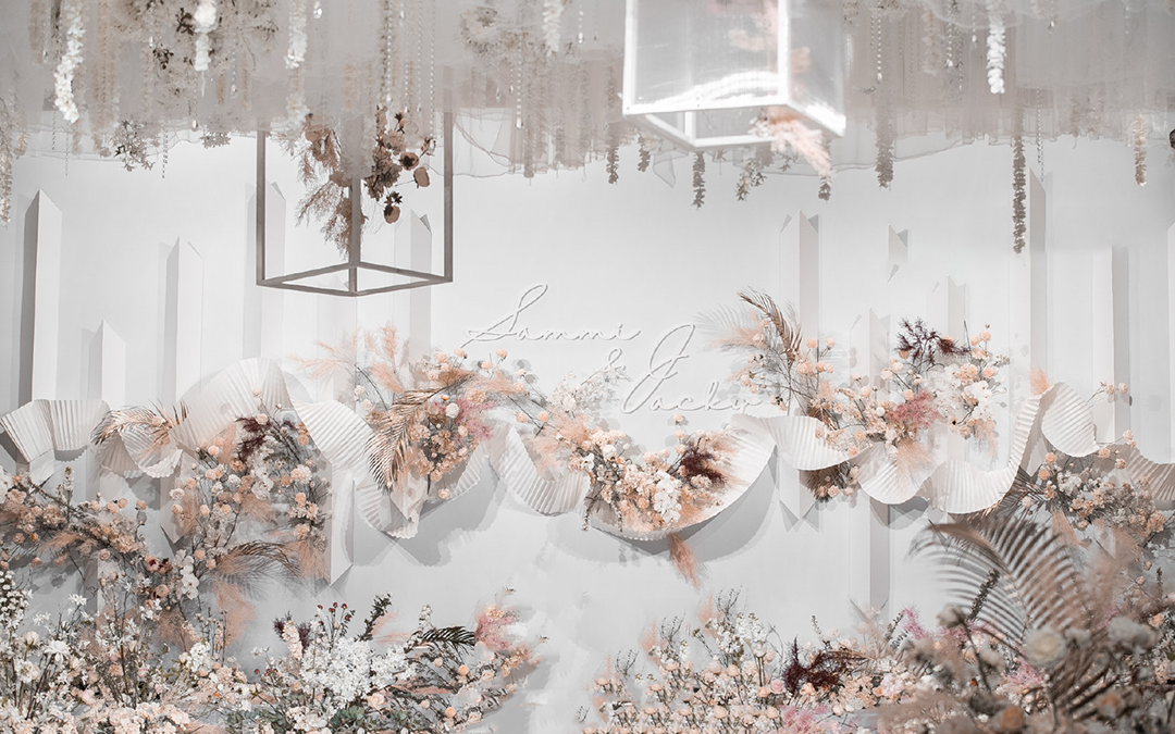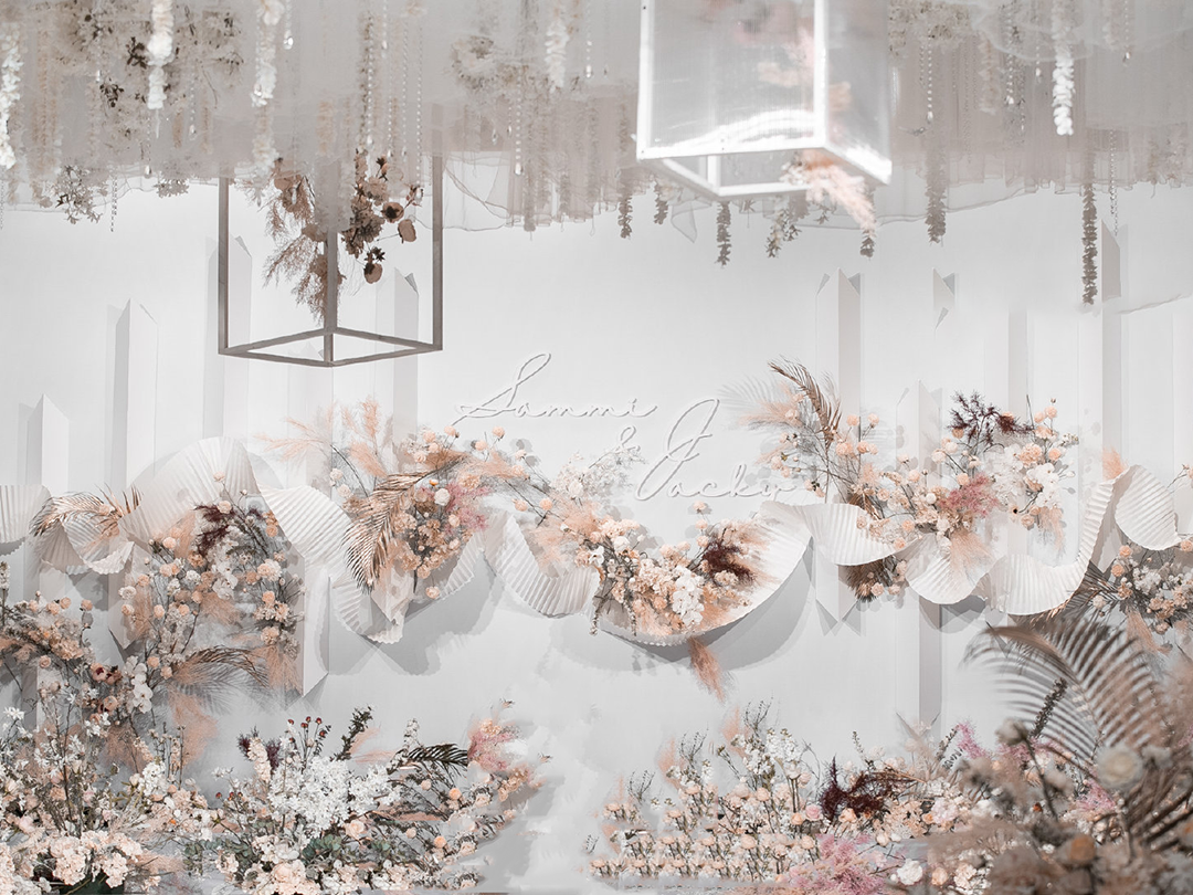 现场鲜花以白粉色调为主