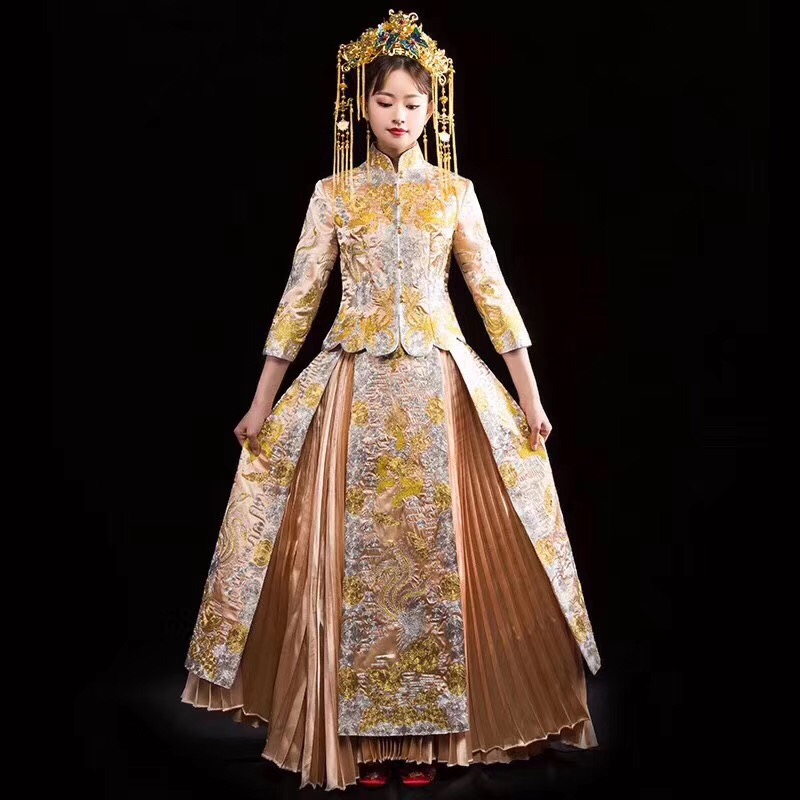 套餐包含: 1高档中式秀禾服一件 2唯美轻奢大拖尾仪式纱一件 3敬酒服一件