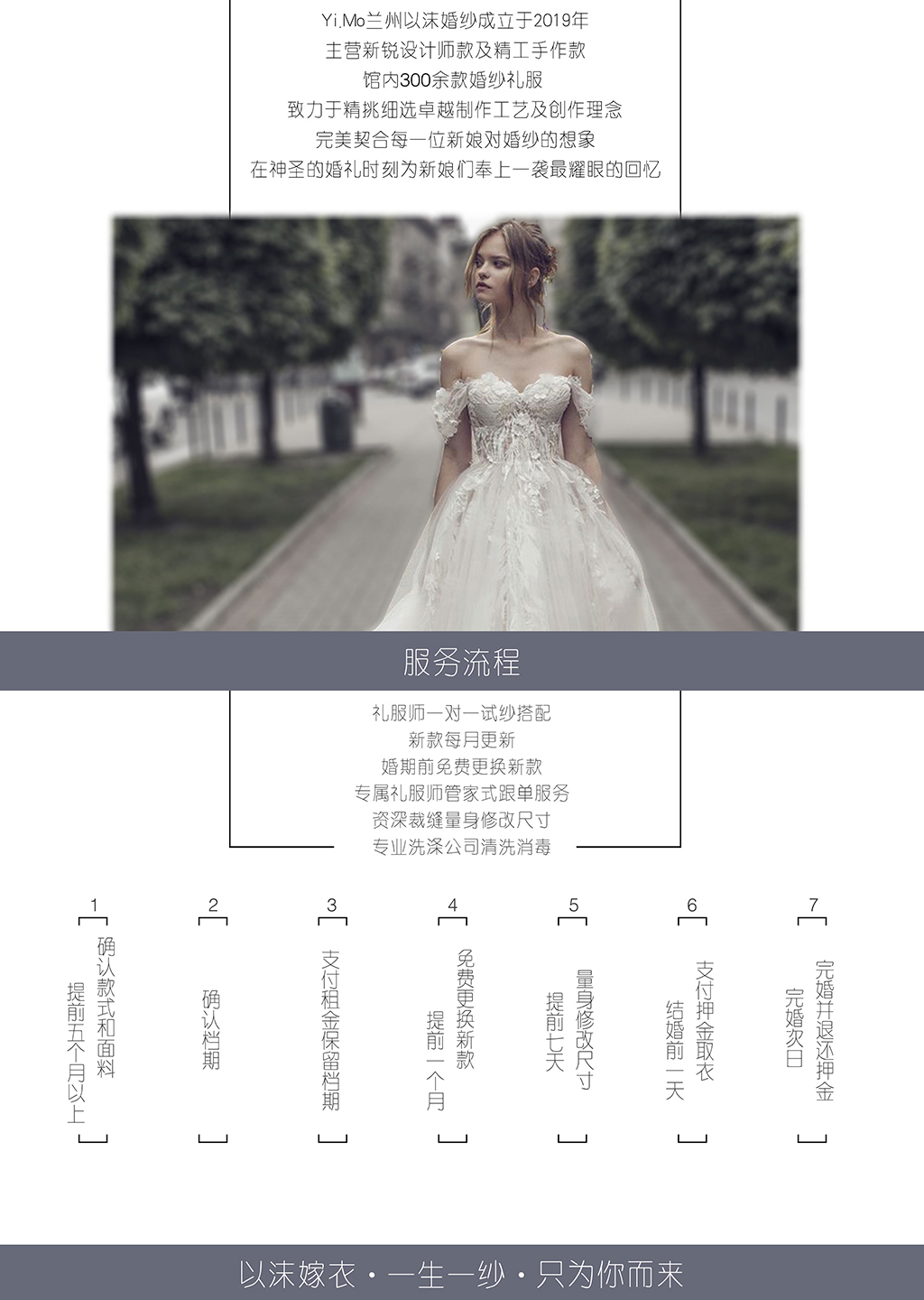 1.预约免费试纱服务 2.高级礼服师二对一顾问式服务 3.租赁婚纱免费修改尺寸服务 4.接受来图定制个性化服务