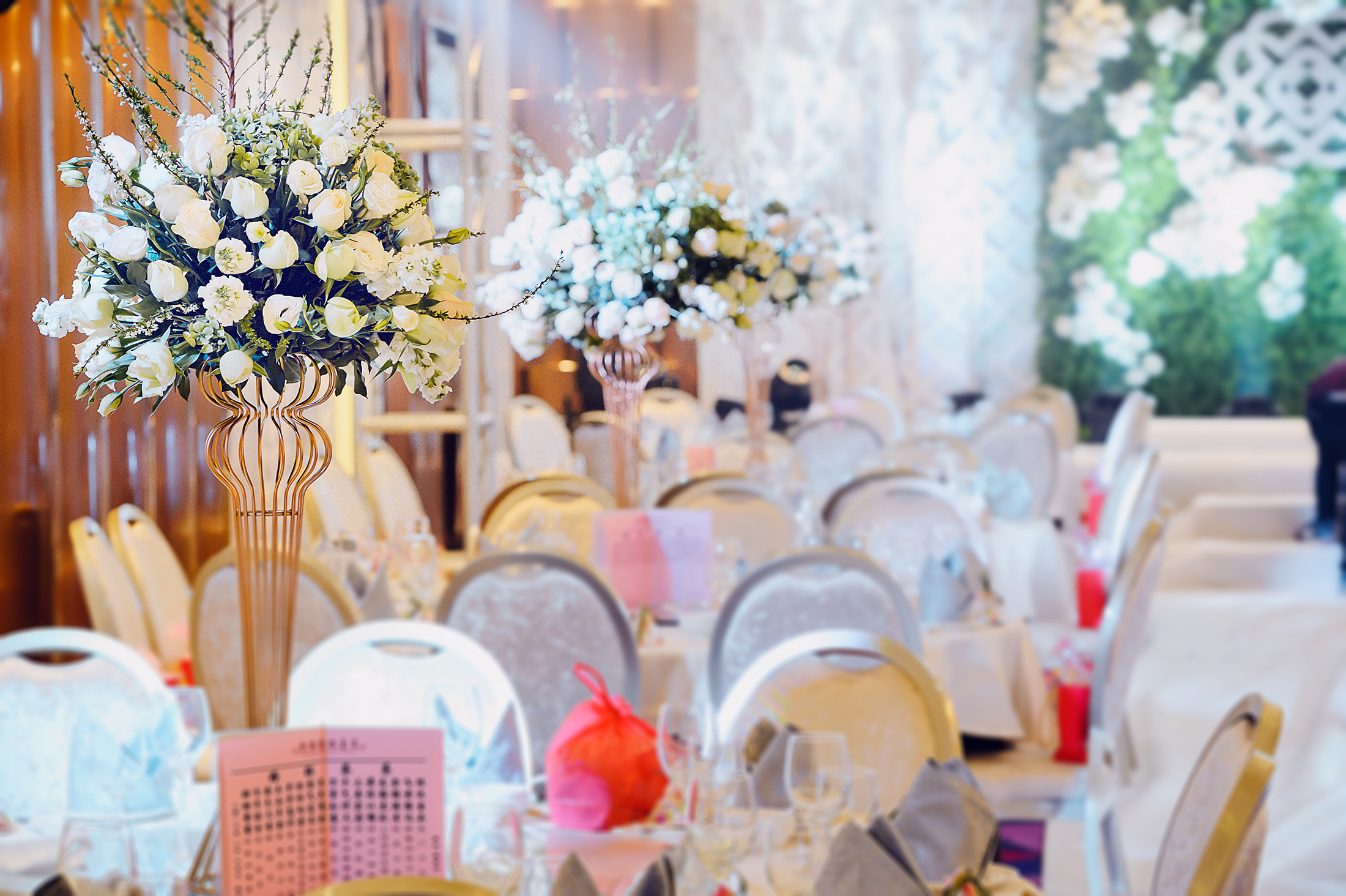 套餐特点:服务项目齐全、主题定制、性价比高 套餐适合人群:适合来宾人数在150人以内的小型室内婚礼 套餐包含的服务内容: 1.人员团队:婚礼设计师、婚礼花艺师、婚礼执行团队、婚礼统筹师等 2.场地布置:迎宾区、签到区、照片展示区、舞台区、通道路引、舞美灯光等 3.花艺设计:主桌花1个、新娘手腕花、胸花、其他区域的花艺