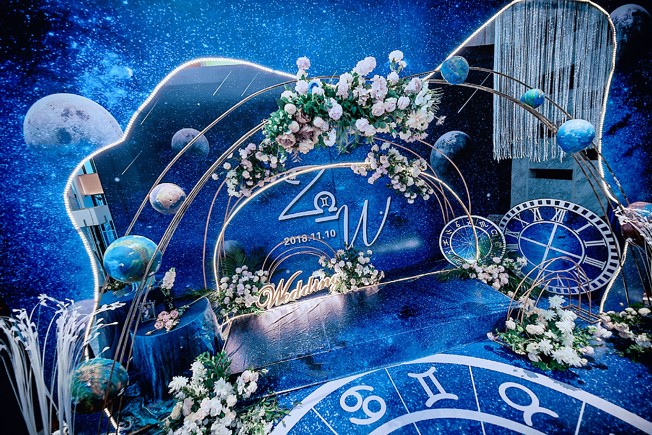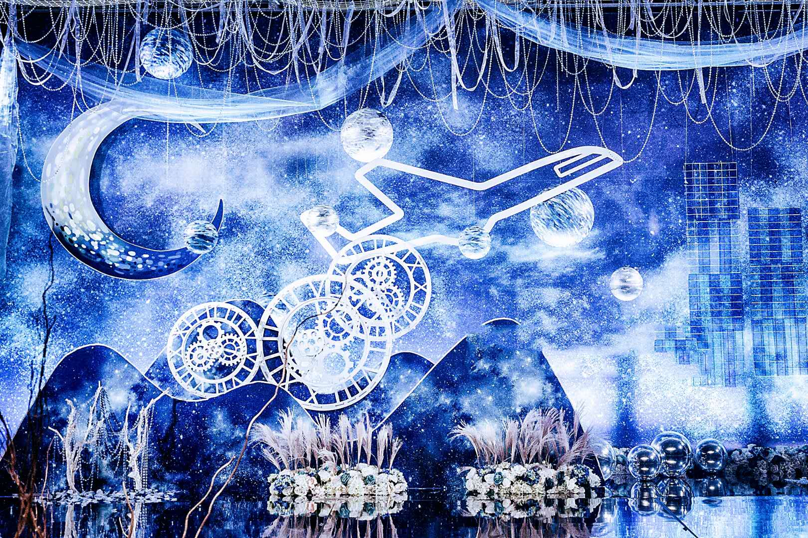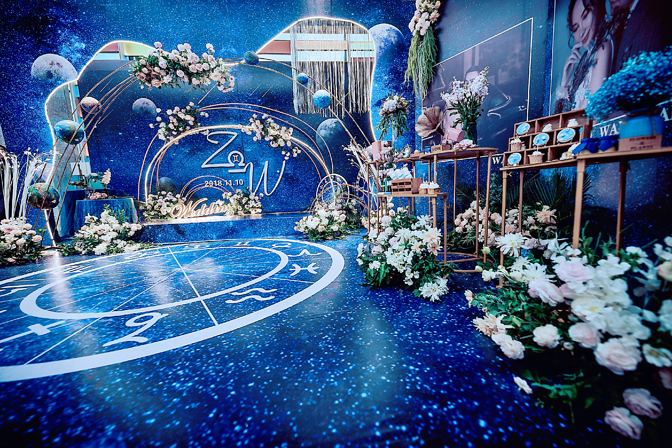 1.迎宾区背景行价3米×6米,和3×6米的立体行架搭建组合而成,背景蓝色星空喷绘主题设计制作,前方使用多个大小星空主题kt板造景,用以星球和时空为元素的主题kt板以及花艺装饰而成,下方搭建迎宾小舞台