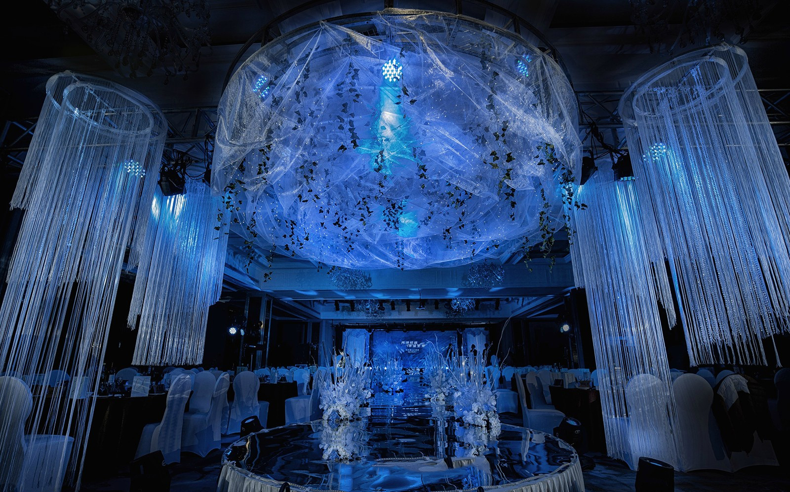 4.T台两侧花艺路引造景装饰,及蓝色LED 灯灯带,路引雪纱,T台上方使用蓝色星空主题喷绘