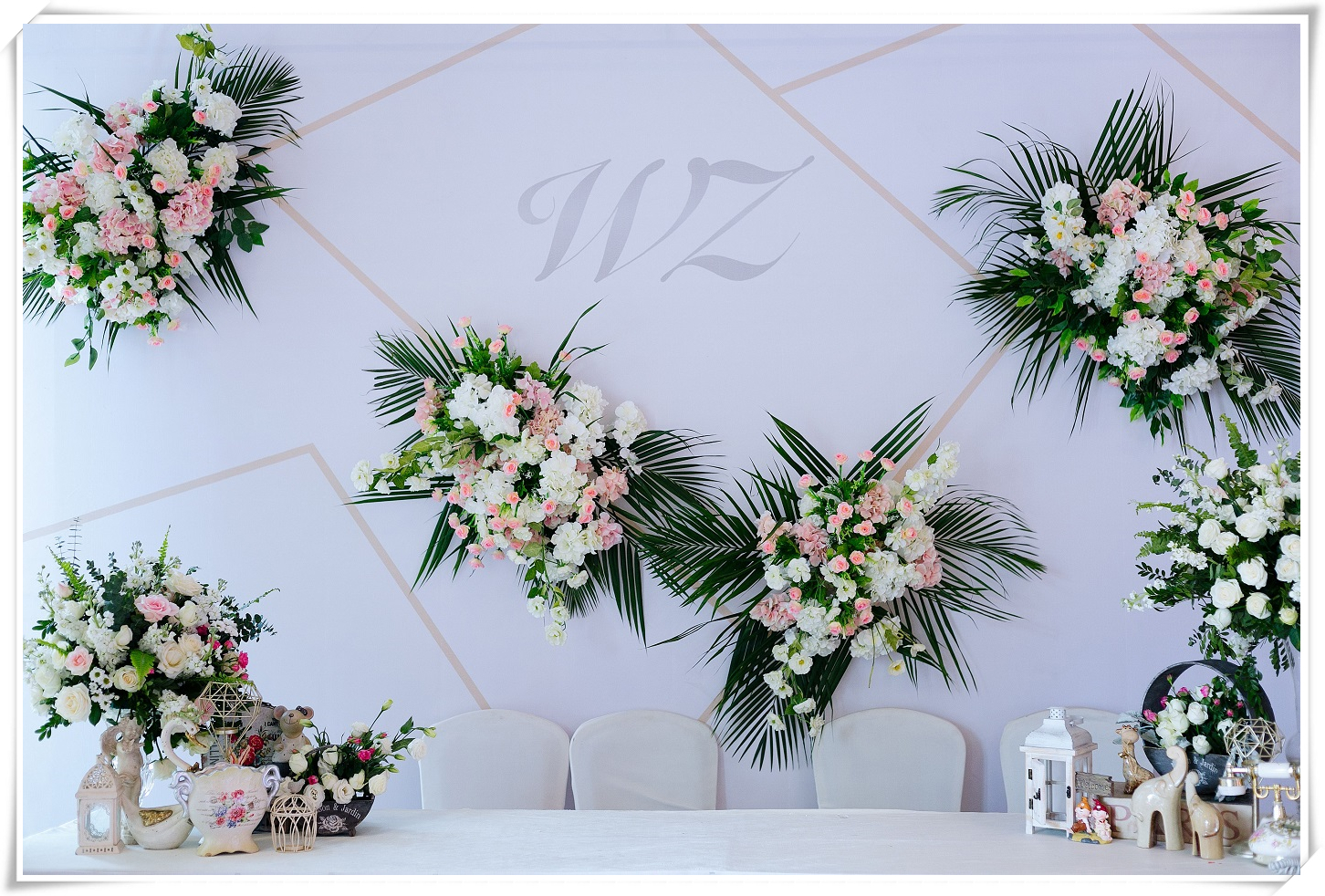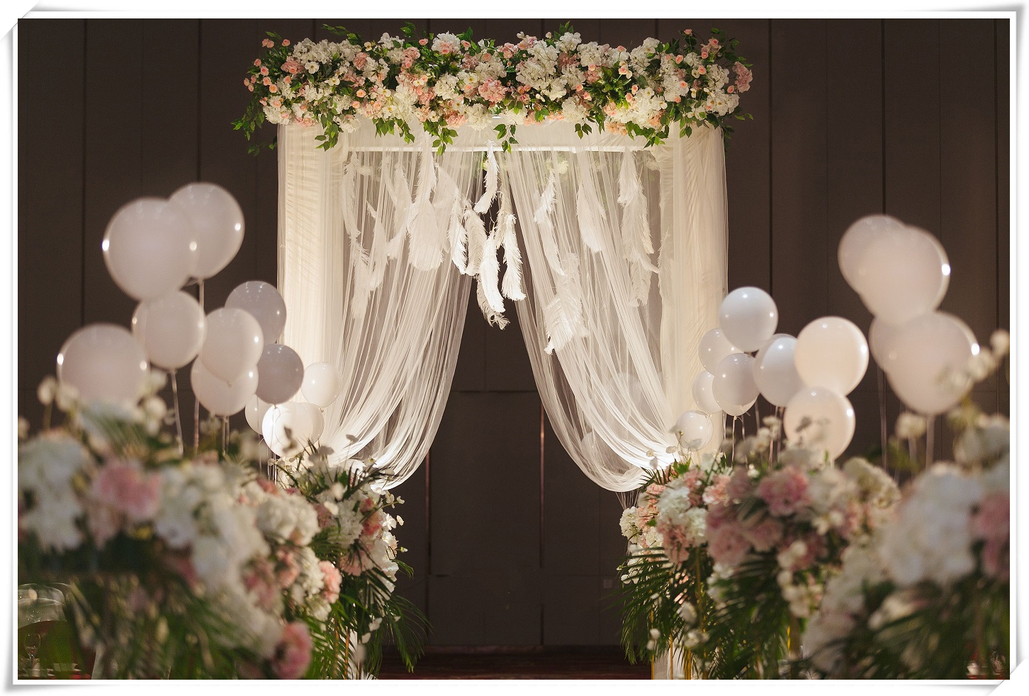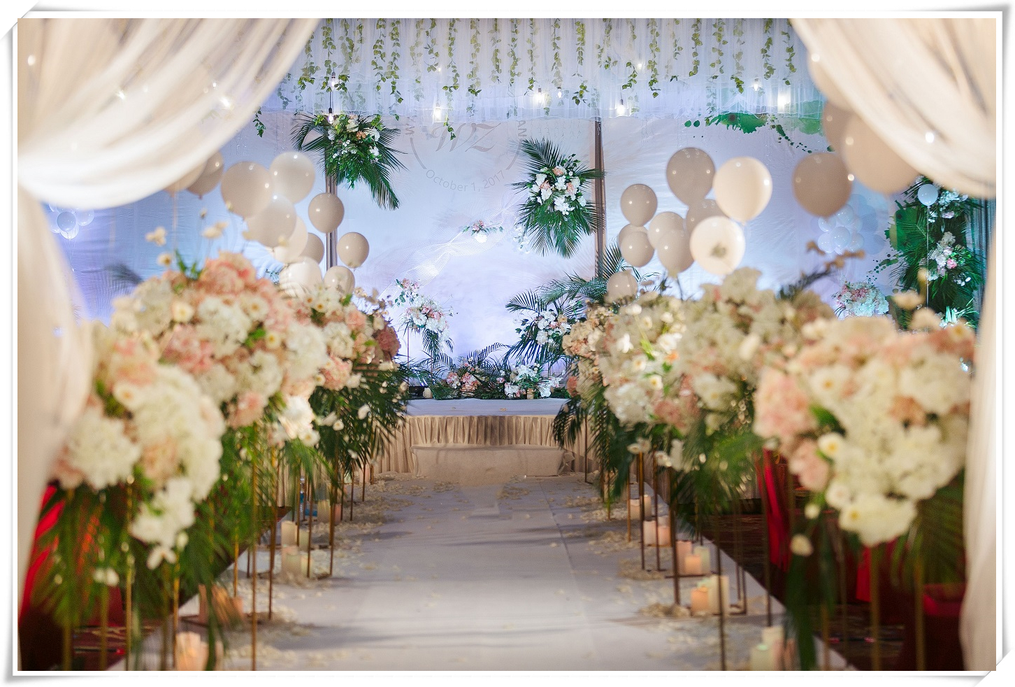 四边交接区与主舞台轻奢几何金相呼应,高低错落的热带花艺跳跃其中 森系与粉色气球点缀两侧,做全世界最幸福的人