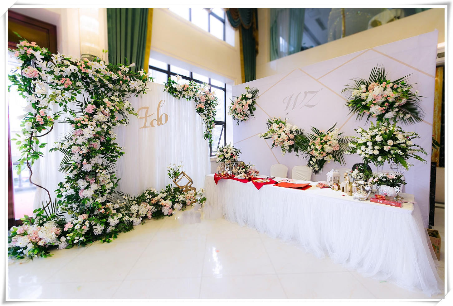 迎宾区4*3喷绘 迎宾区架子一套4*3 花艺1组 主题LOGO设计一组 金色铁艺一组