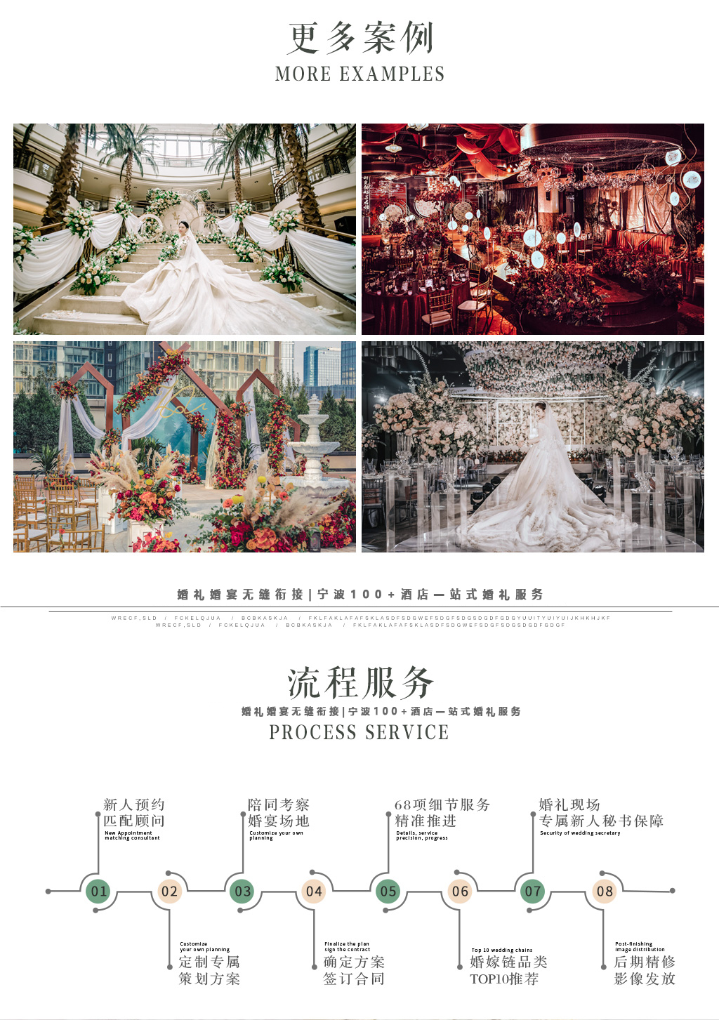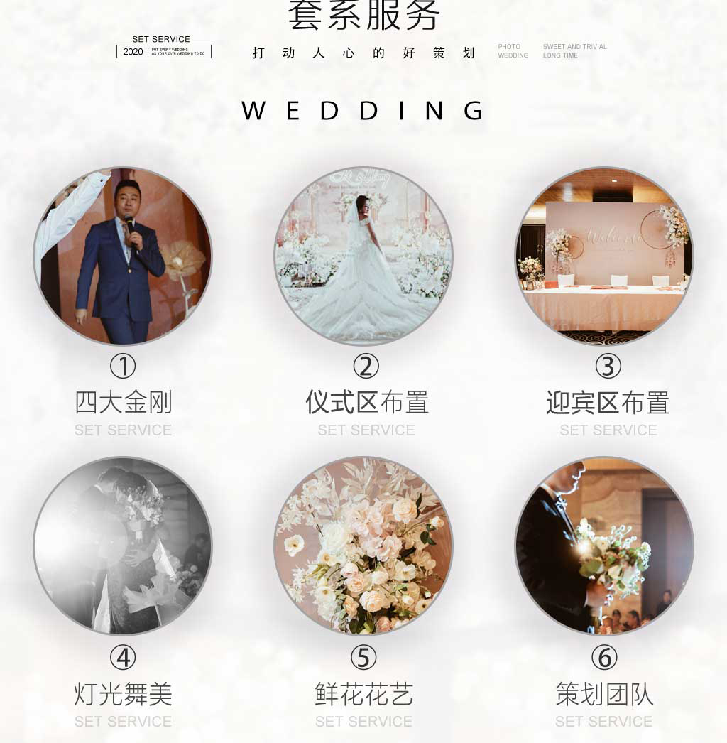 T台 1套 白地毯1套 铁艺路引10个 花艺10组 蜡烛10组 空飘30个 主背景喷绘1套 主背景拉顶1套 主背景飘沙一套 交接区4角亭一套