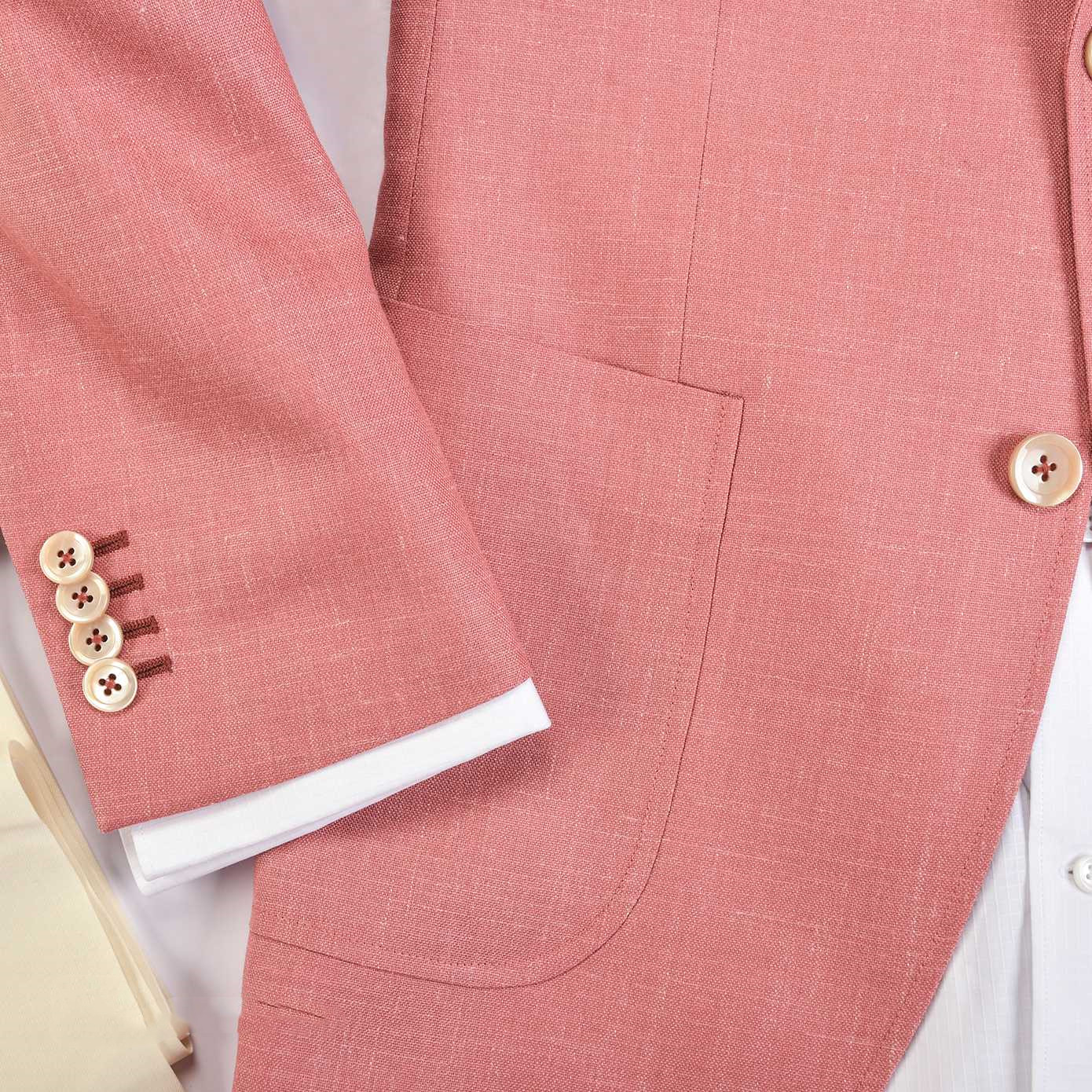 伽品绅士粉色西装套装五件套: 西服、西裤、衬衣、领带/领结、口袋巾。