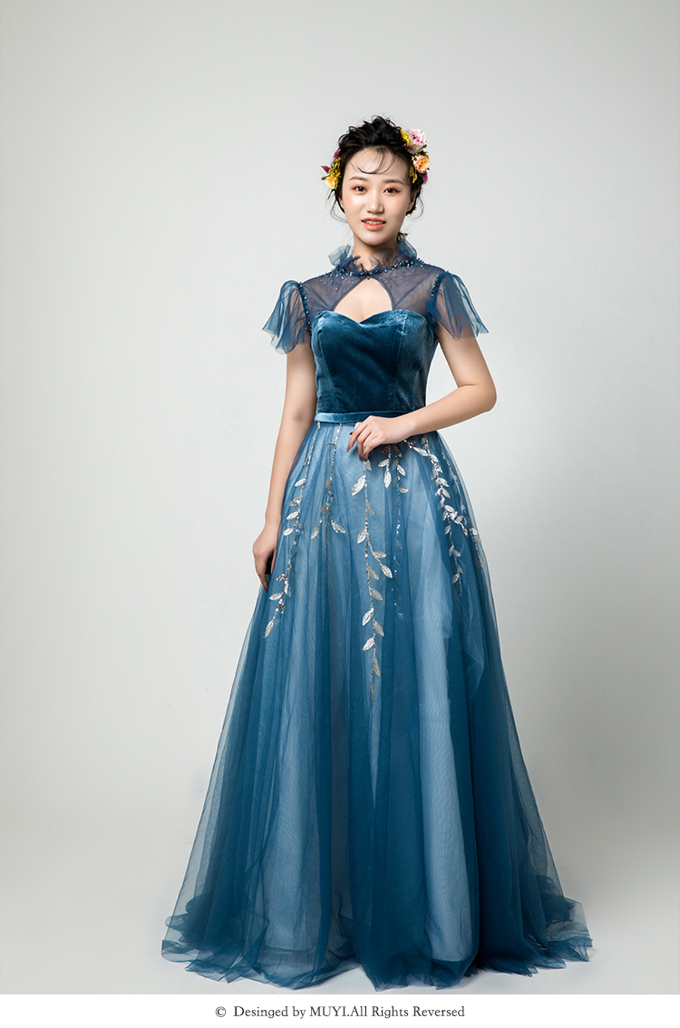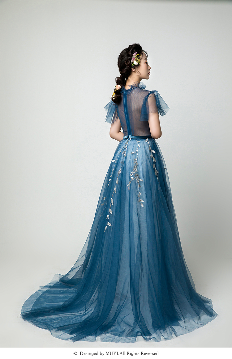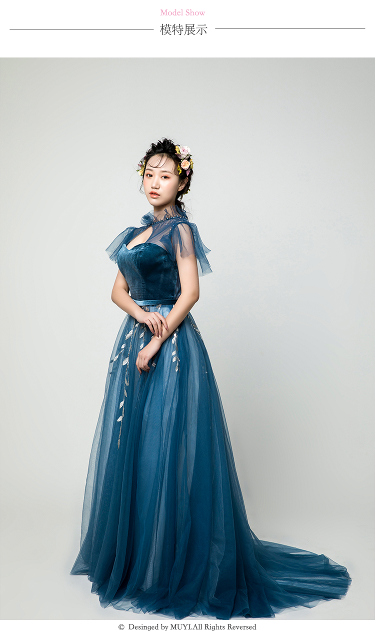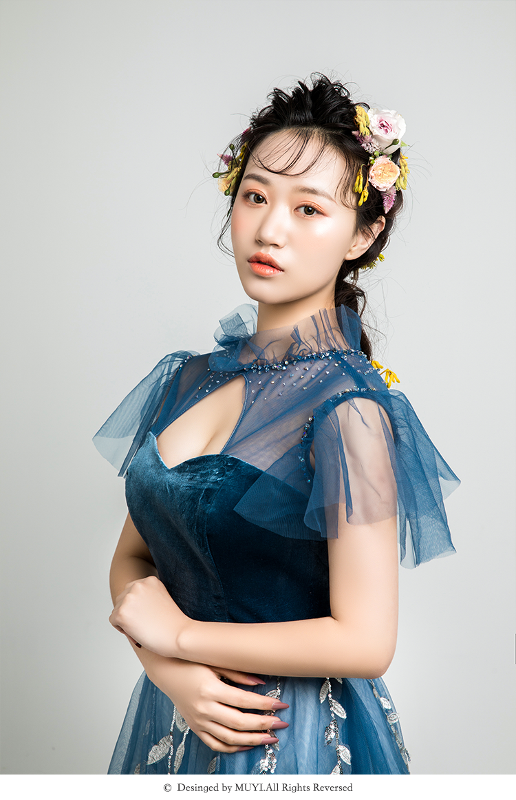 【VANSTAR】高腰A森系甜美深蓝色敬酒礼服