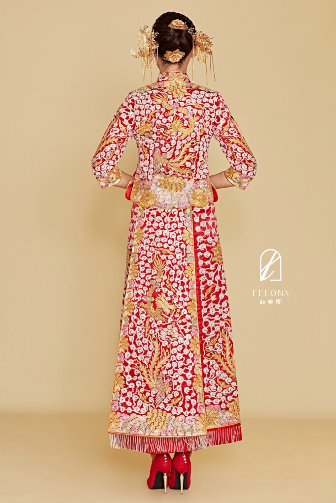 FEEONA蒂芙尼浪漫主纱系列包含: *大拖尾主纱一件 *出门纱或秀禾一件 *敬酒服一件 *伴娘服三件