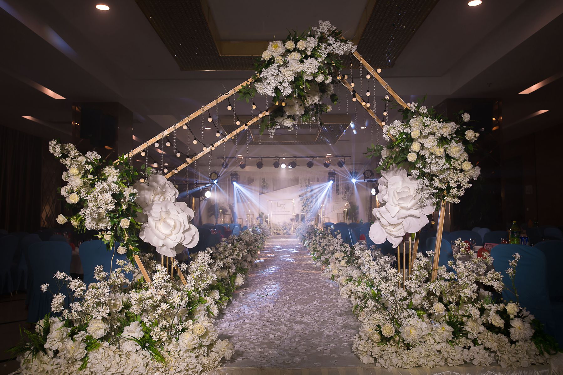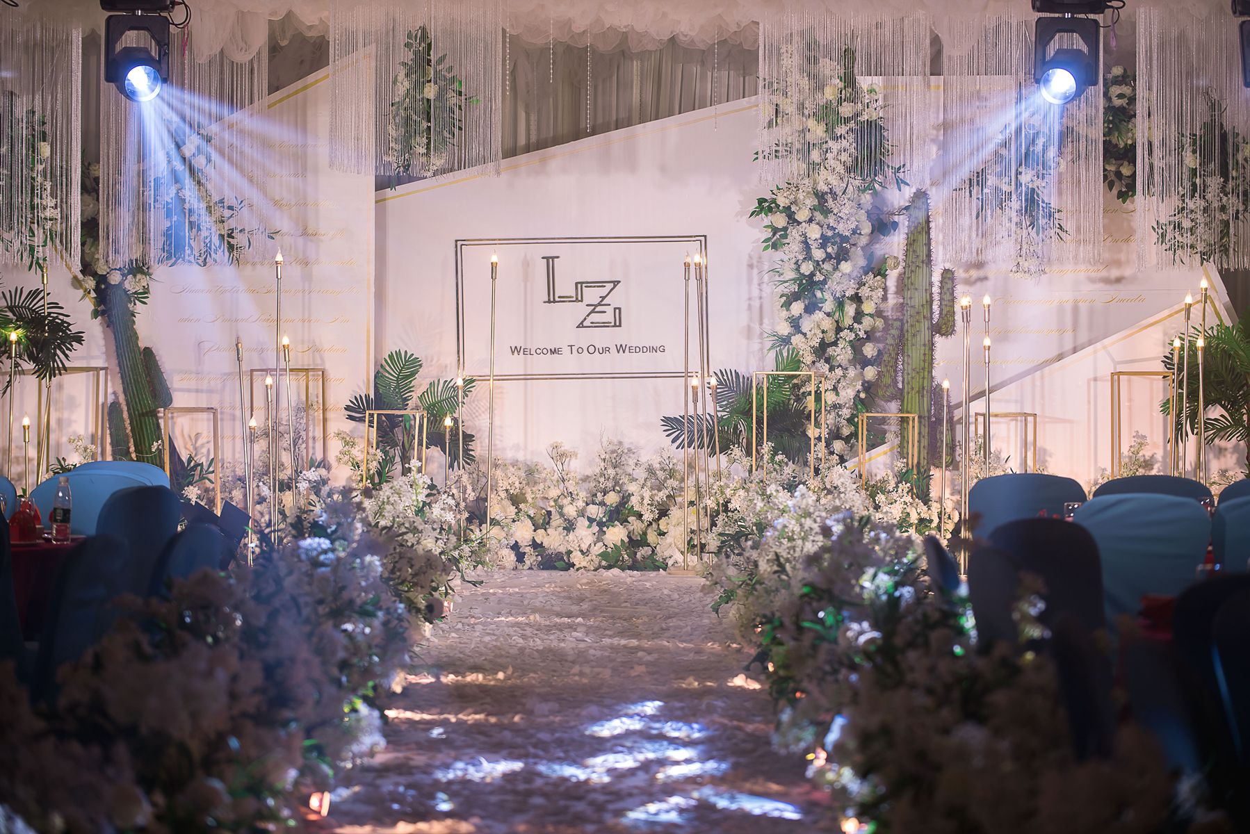 婚礼背景,花厅,T台,路引,音响,帕灯,染色灯,光束灯,追光灯,面光灯。
