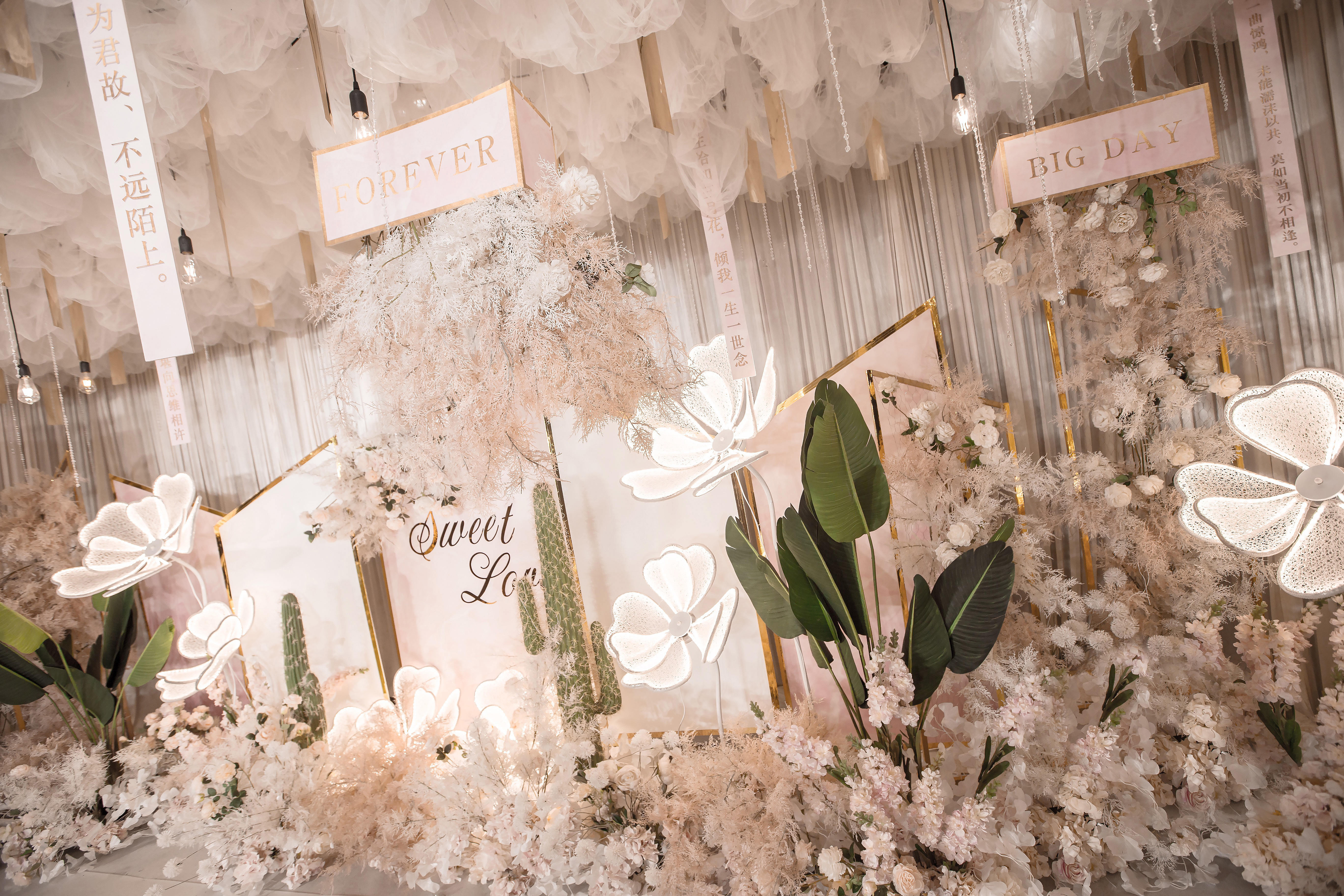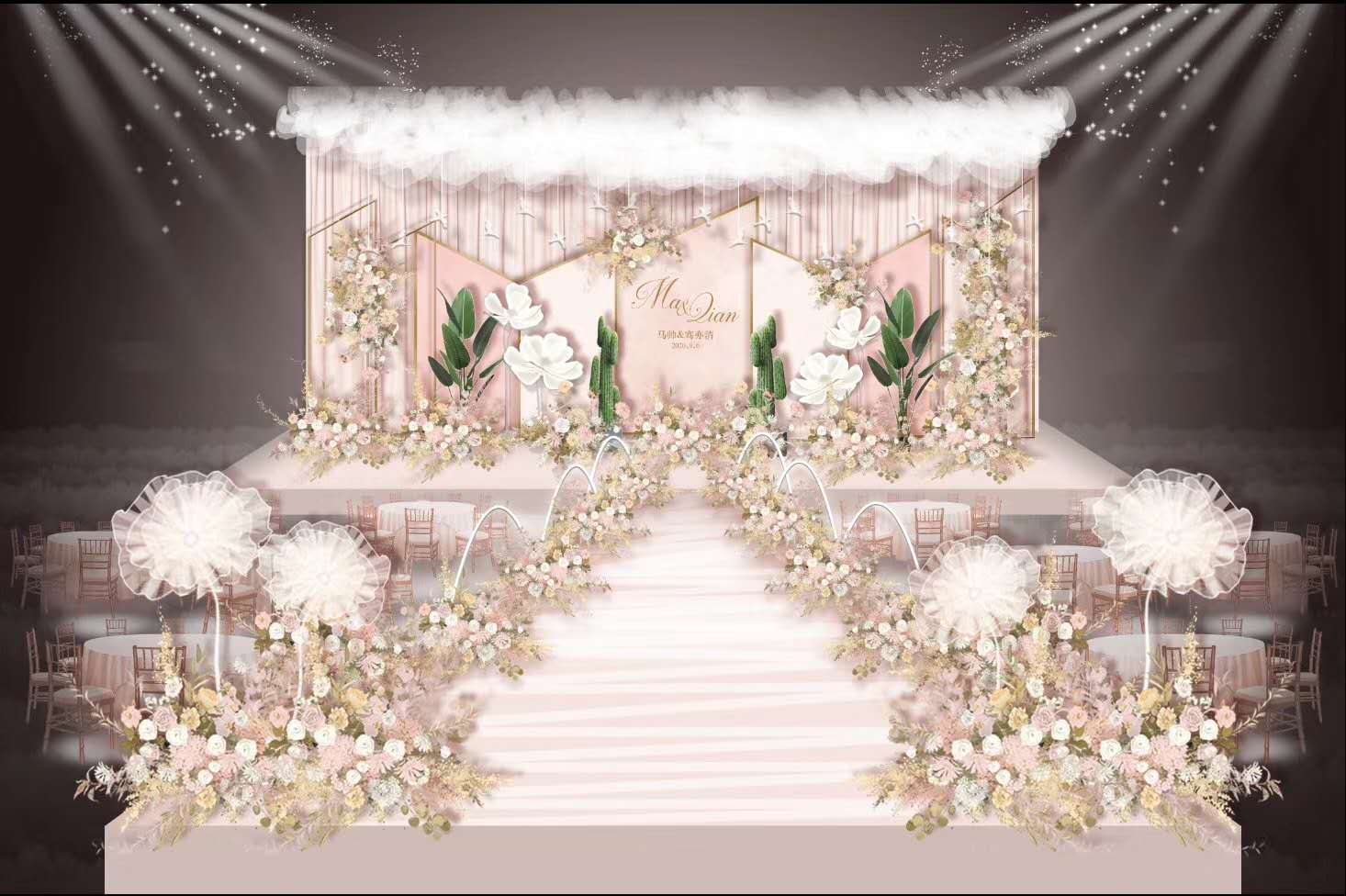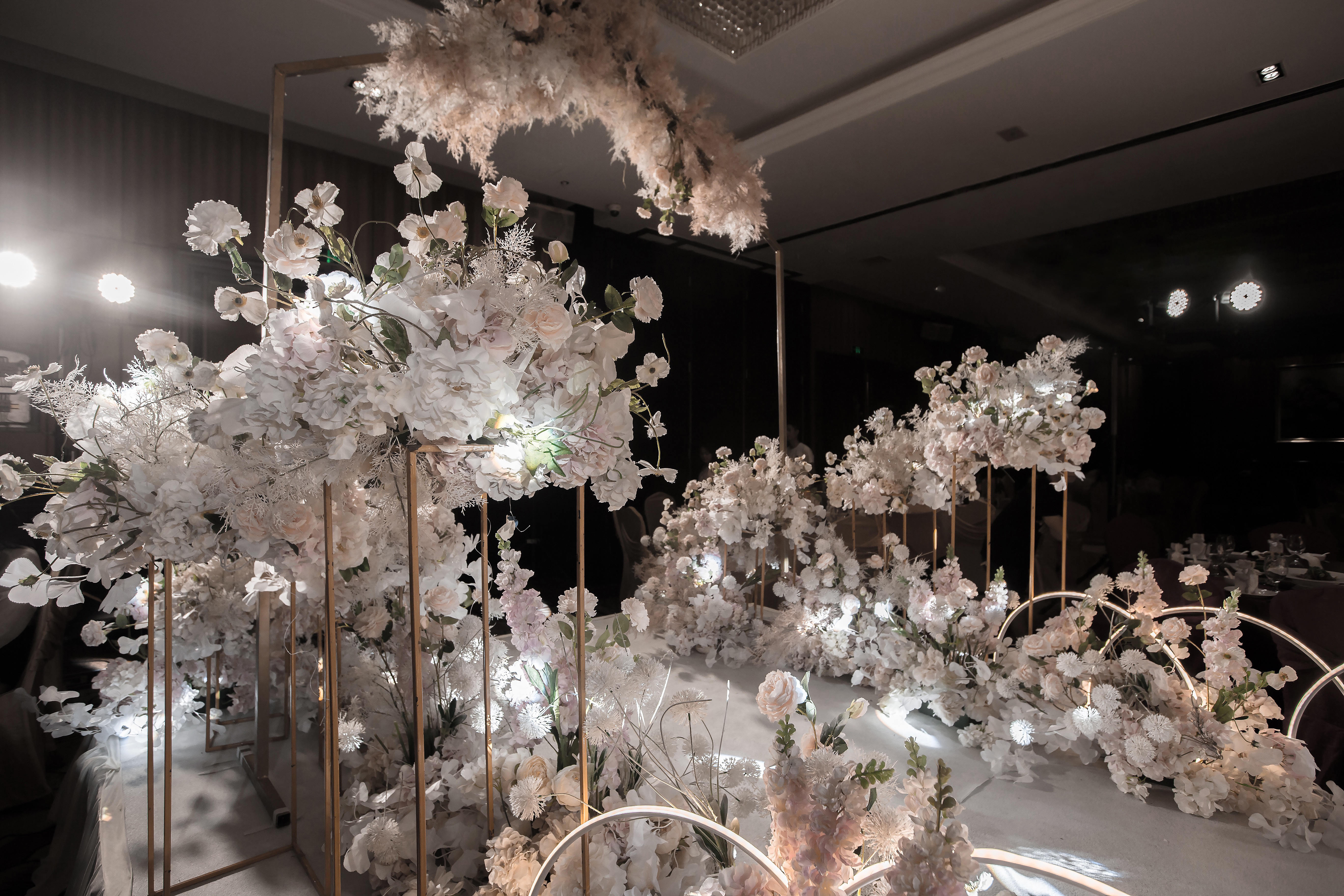 以下项目为套餐参考,颜色,风格,尺寸可根据新人的喜好和酒店的实际场地协商更改 1.主题喷绘 2.顶部亮片吊顶 3.主题花艺