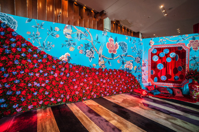3、签到区个性主题KT板背景设计以及中式摆件(文房四宝一套,算盘一个,梳子一把,剪刀一把,尺子一把,古典镜子一面,中式花瓶一套五谷丰登斗一套)